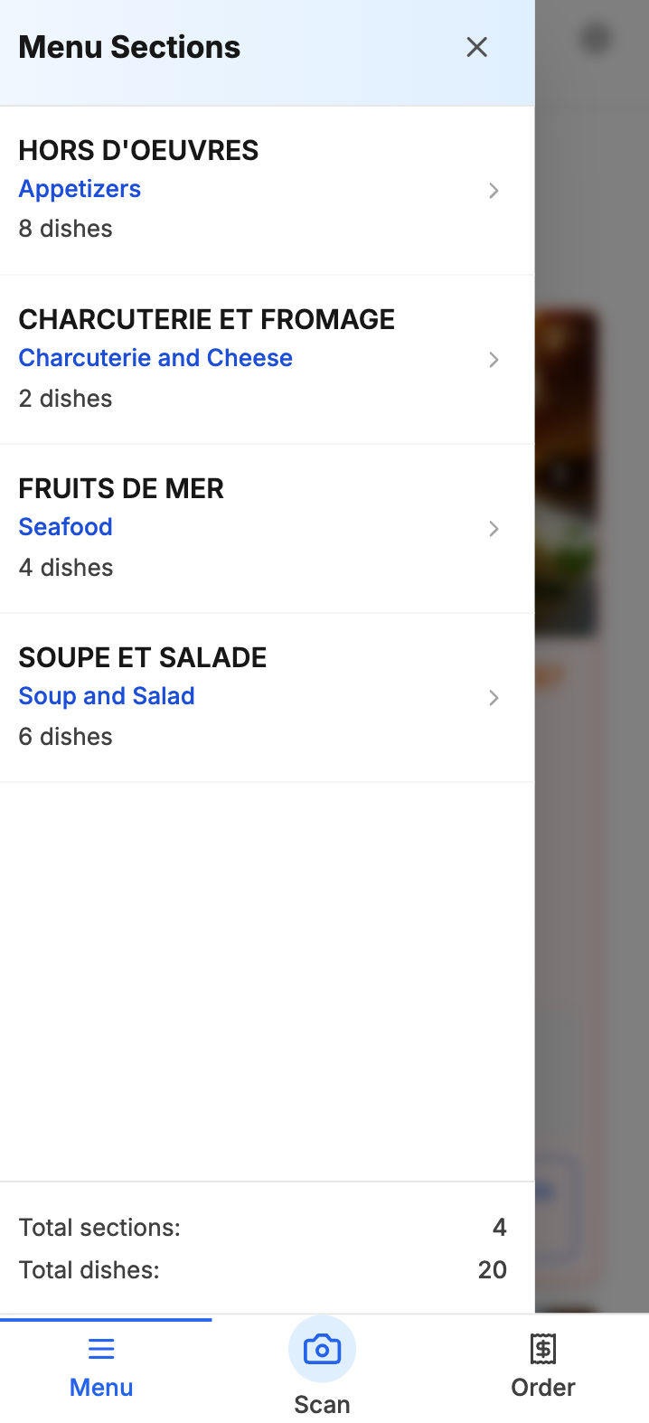 - Intelligently recognises menu sections (e.g., appetisers, entrées, soups).