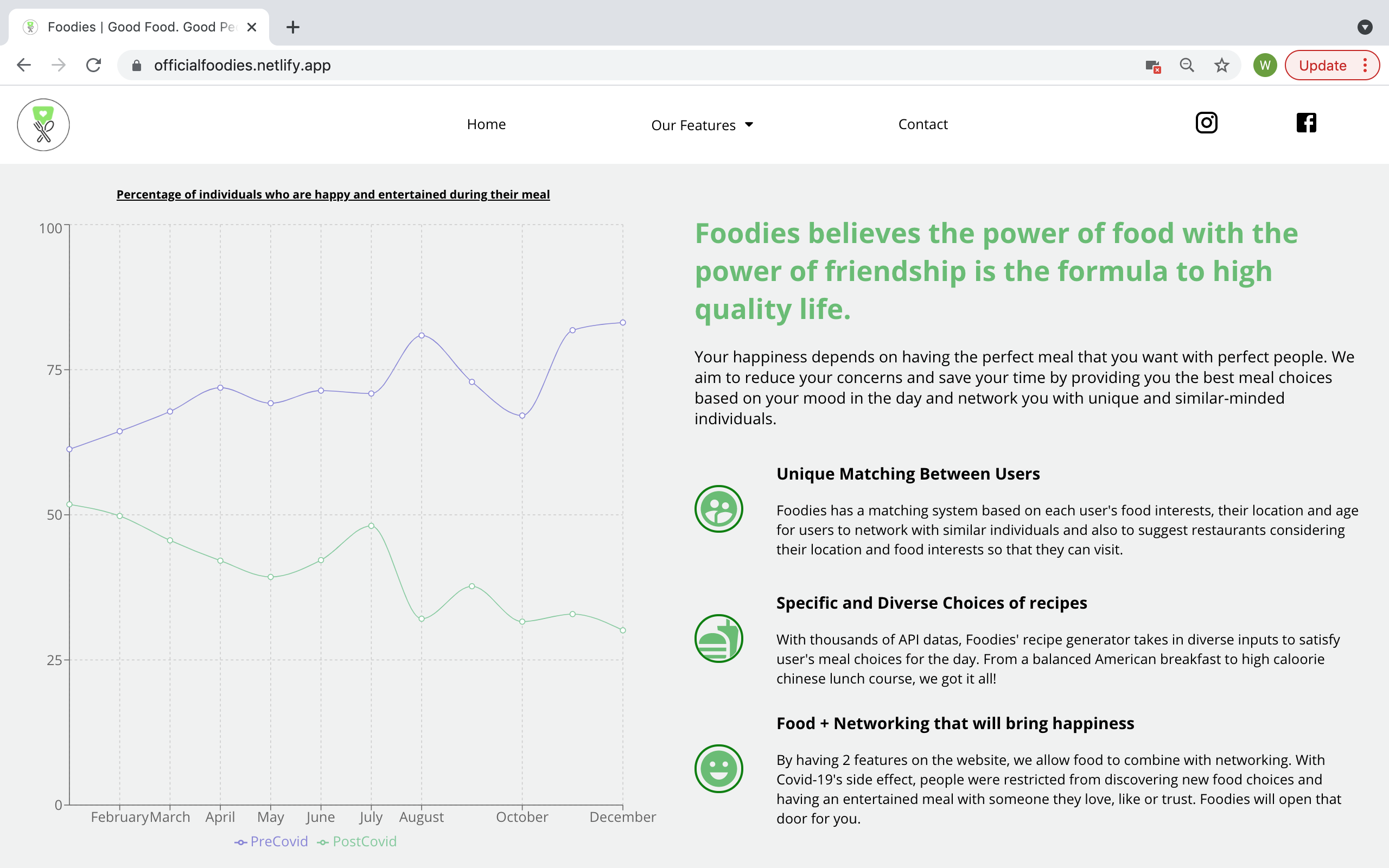 Foodies provides multiple services that will help people overcome the depressive mood due to the quarantines or maybe due to other factors; A chat feature that matches people based on their information, their interests and their favourite food types, along with a random recipe generator feature. These combined features are able to pick the perfect meal that you need for the day and also allow to have conversations with the people near you and who have similarities in terms of hobbies and food. On top of the chat feature, you can create posts about the restaurant you are planning to go, the food you will order, and your additional information to get other people to come to eat with you, you can direct message people or send it throughout the entire chat system(everyone gets it). This will catch other people's attention and maybe they will come with you and this way, you can make new friends and relationships. After planning a date with them, there is a email reminder option that you can use to get email reminders about the time you selected to go to the restaurant, the menu you will order, and the restaurant you are planning to go to make sure you don't forget!