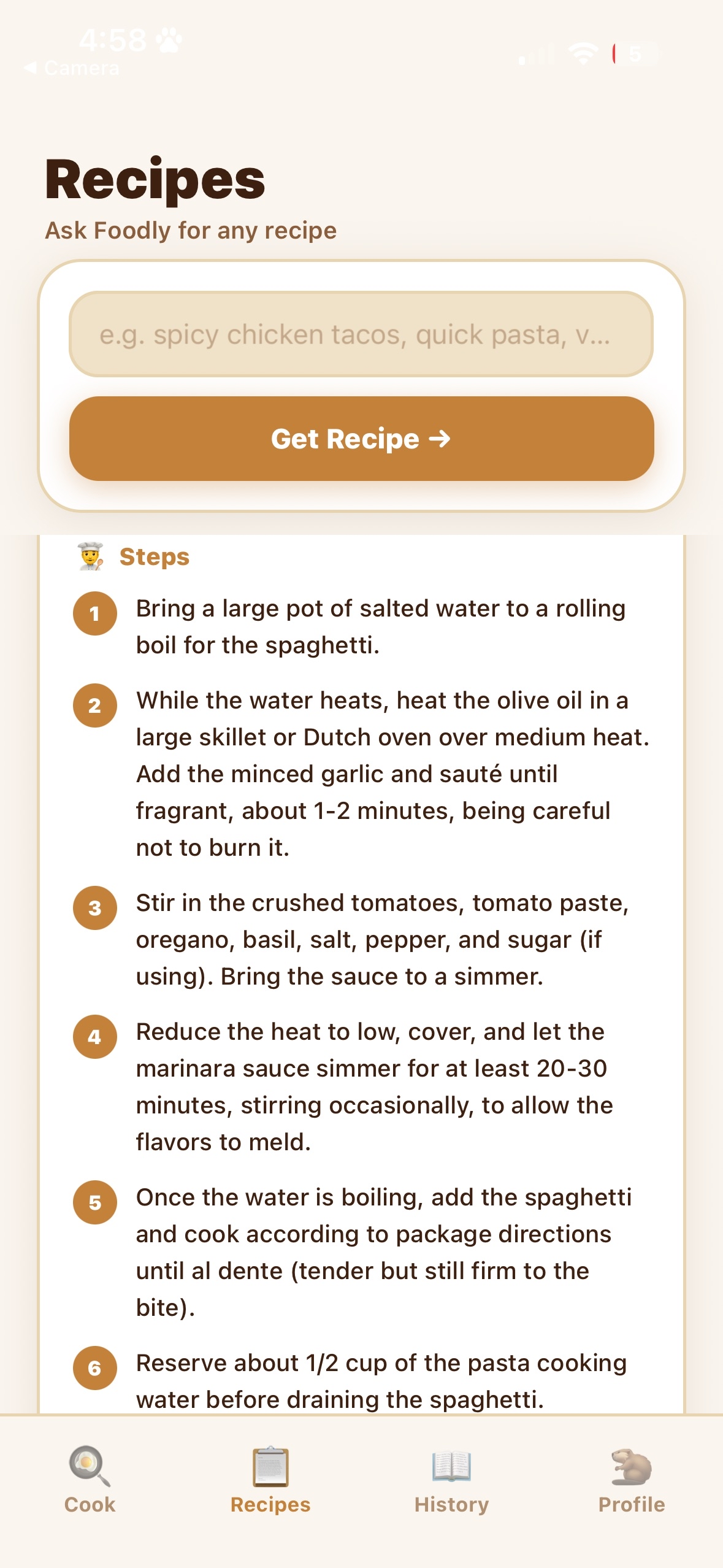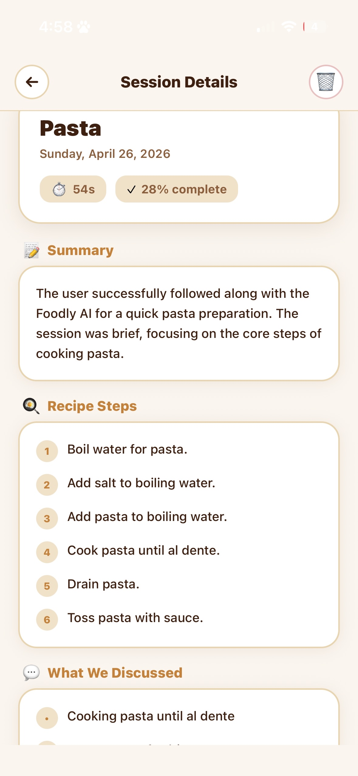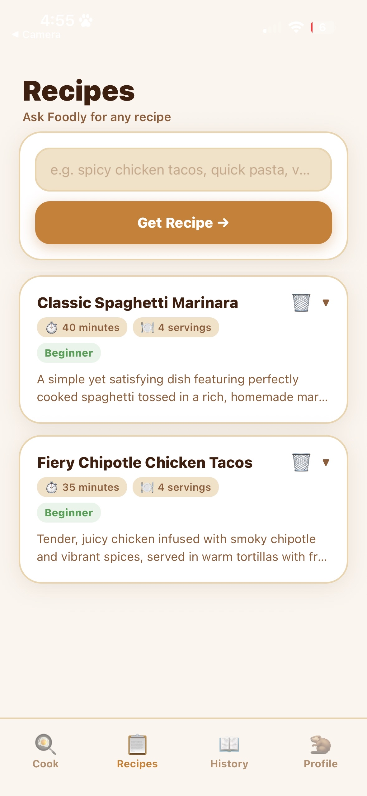 - Generates Recipes on the Fly: Need a 15-minute vegan pasta? foodly drafts the recipe, saves it to your history, and then walks you through it step-by-step with visual guidance.