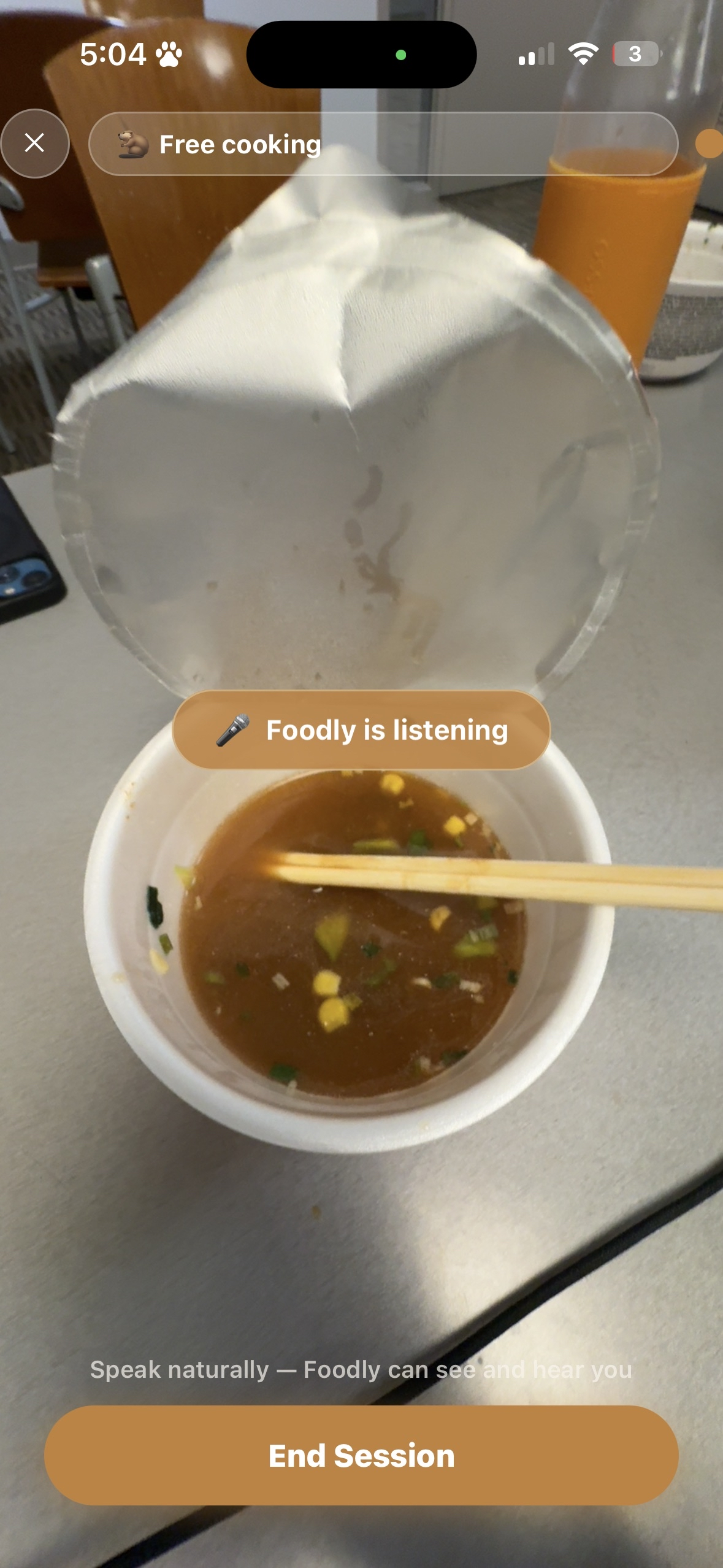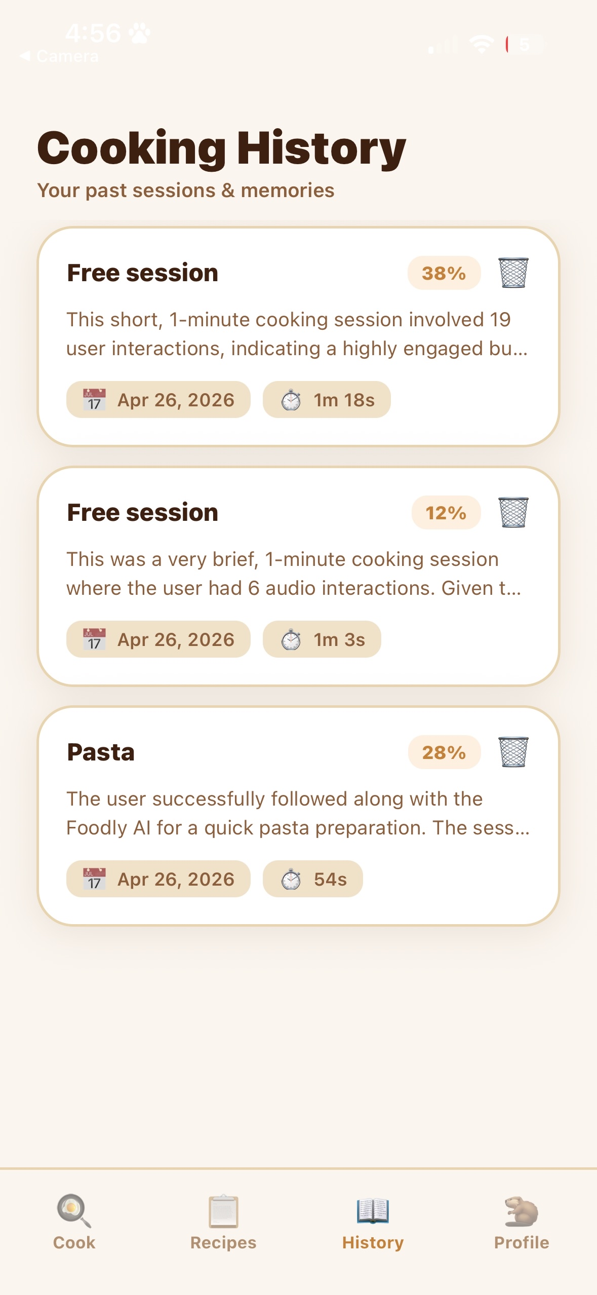 - Live Voice and Video Guidance: Using the Gemini Live API, foodly provides real-time voice feedback while watching over your cooking, telling you when to stir or if your oil is shimmering.