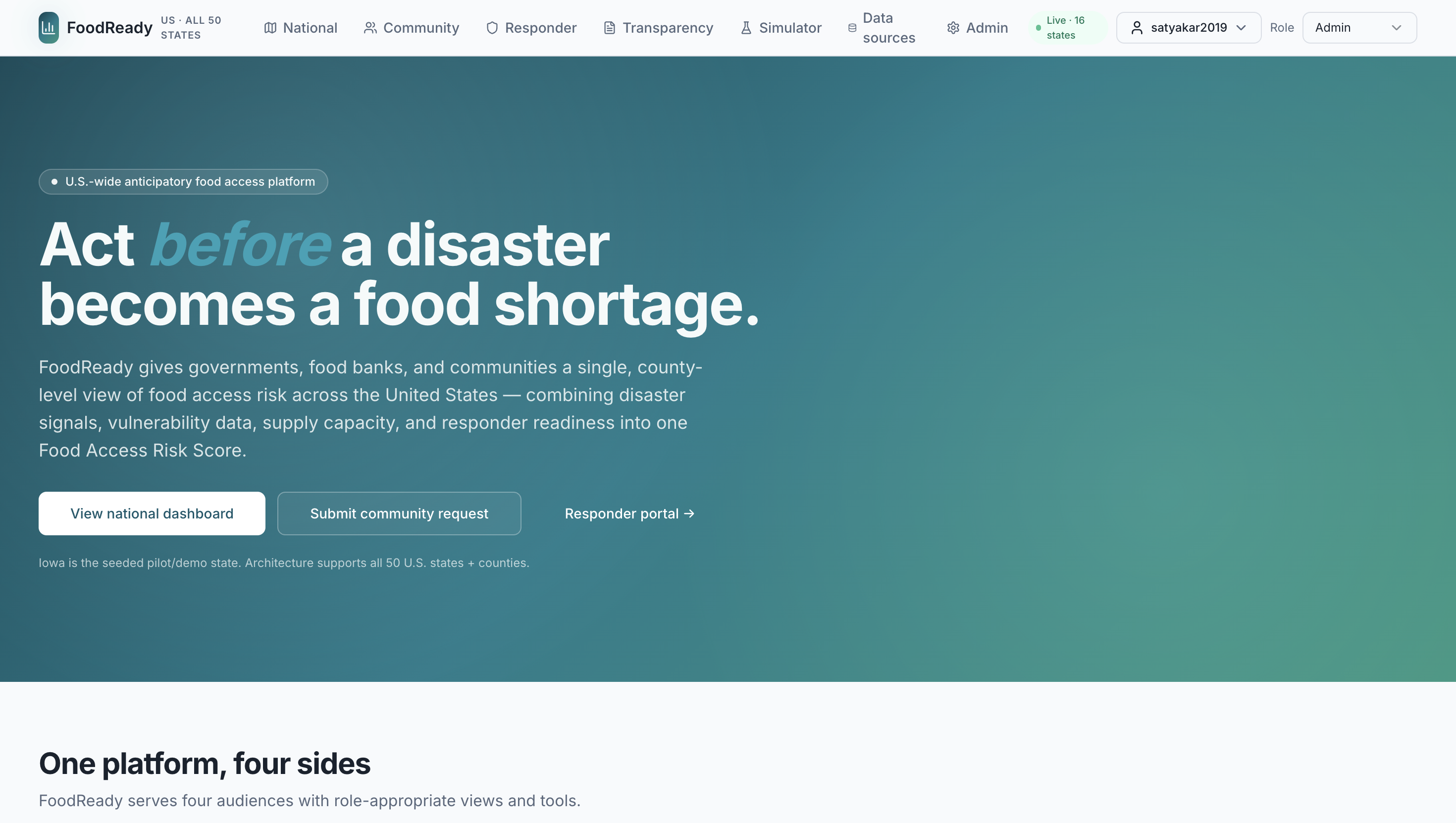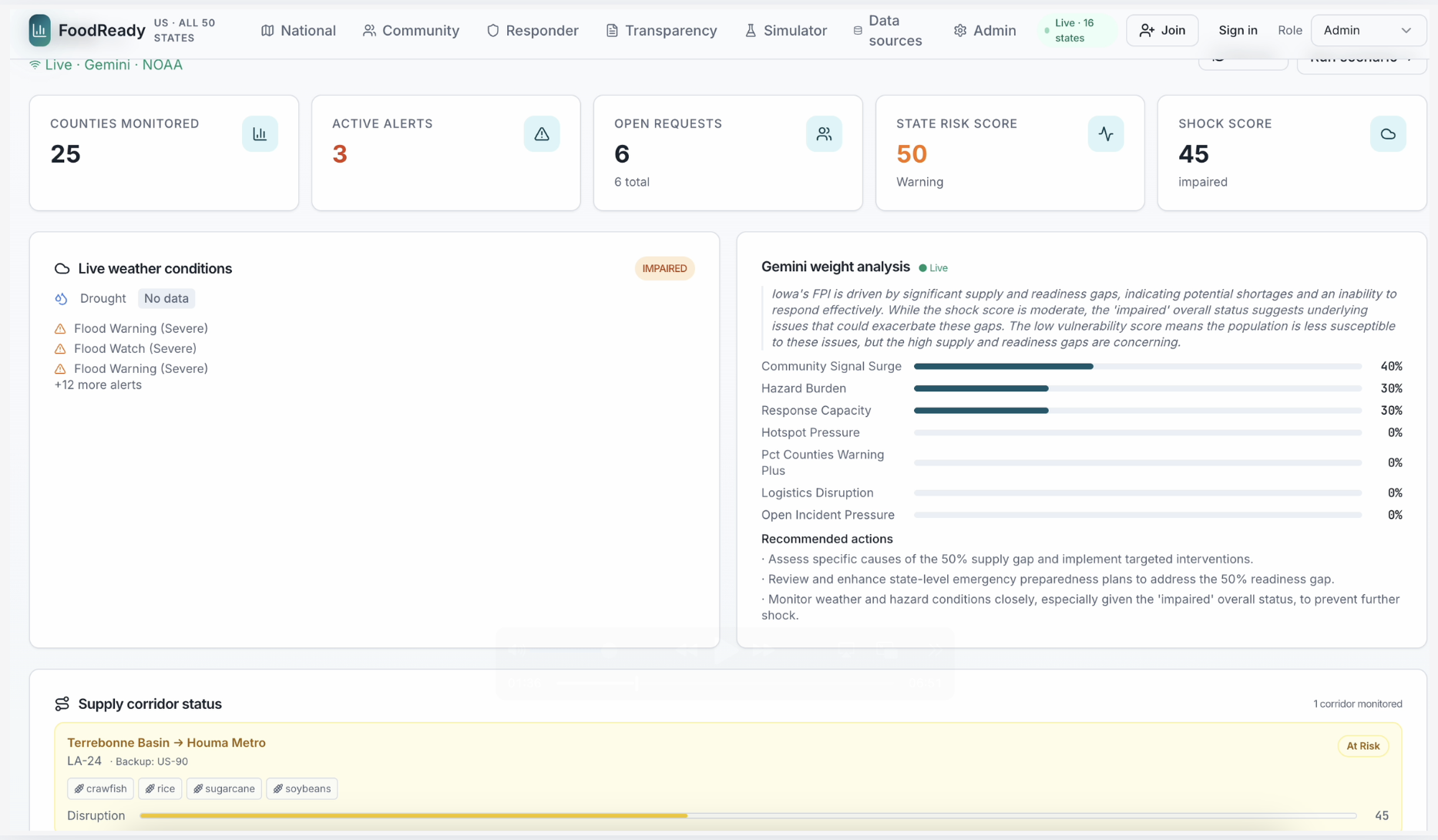 FoodReady serves as a real-time situational awareness dashboard and early-warning system for the American food supply chain. By synthesizing disparate environmental and socio-economic data, it provides predictive risk mapping, supply corridor & infrastructure monitoring, and full-lifecycle incident management.