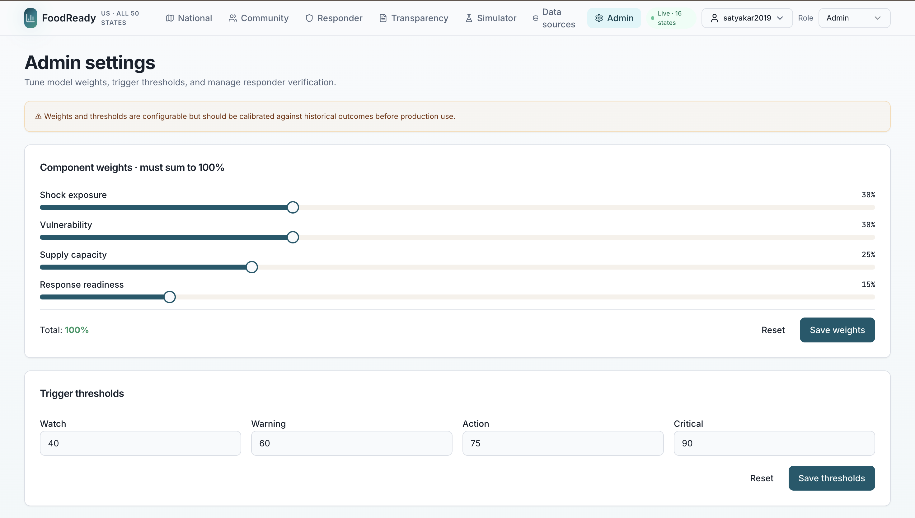 The Math: The Food Pressure Index (FPI) At the heart of FoodReady is the FPI, a composite score calculated for every county. The baseline formula follows a weighted linear combination: FPI = the sum of shock exposure, vulnerability, supply capacity, and response readiness, multiplied by respective weights.