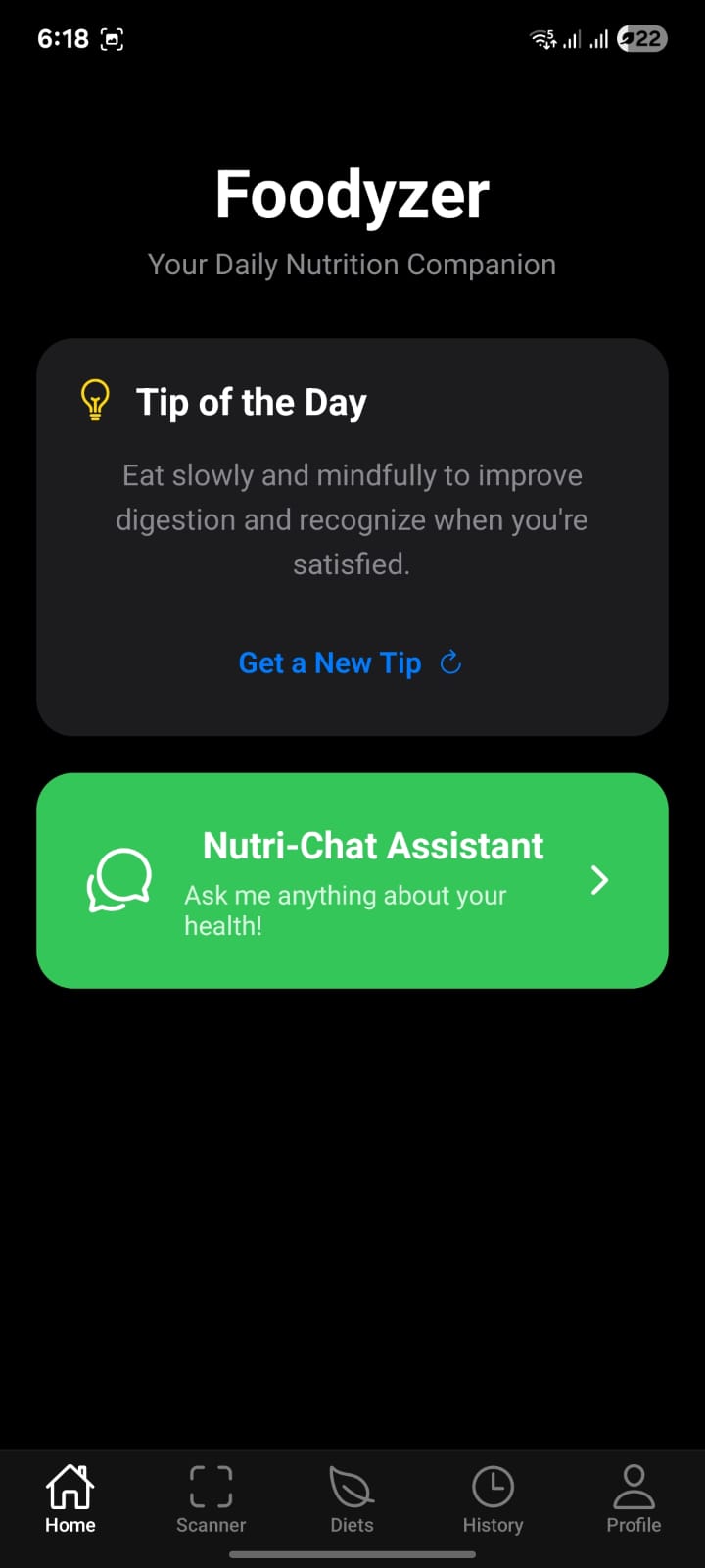 Welcome to Foodyzer! Get your 'Tip of the Day' or chat with your AI nutritionist to start your personalized health journey.