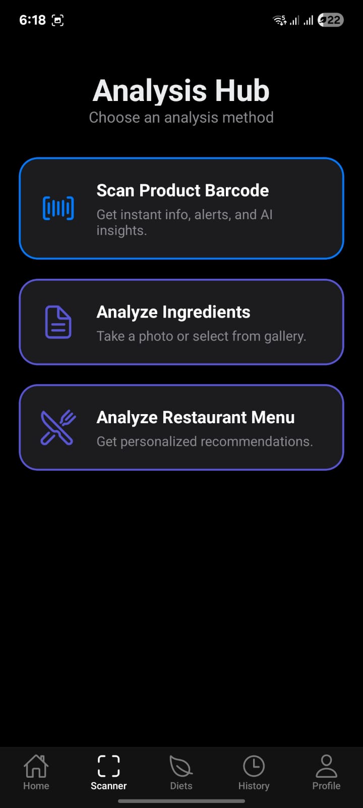 The Analysis Hub: Scan product barcodes, analyze ingredient lists from a photo, or get recommendations from a restaurant menu.