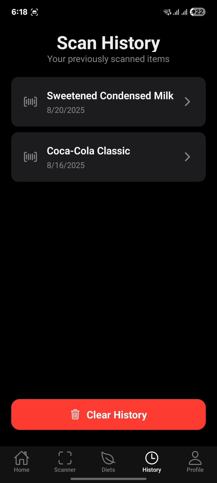 Keep track of your journey with a detailed Scan History. Revisit product details and AI insights anytime you need them.