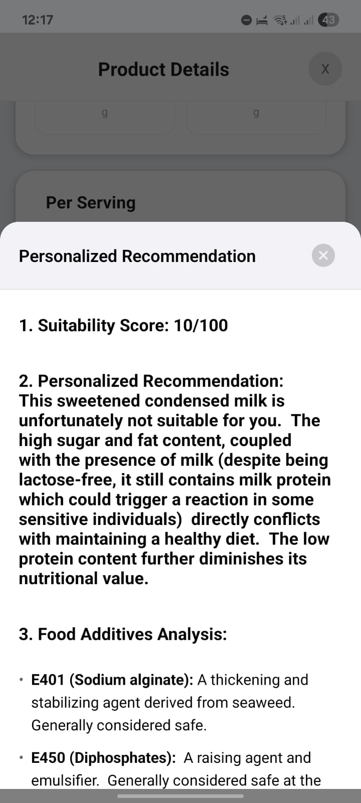 AI Recommendation: After every scan, our AI provides a "Suitability Score" and detailed advice tailored to your unique health profile