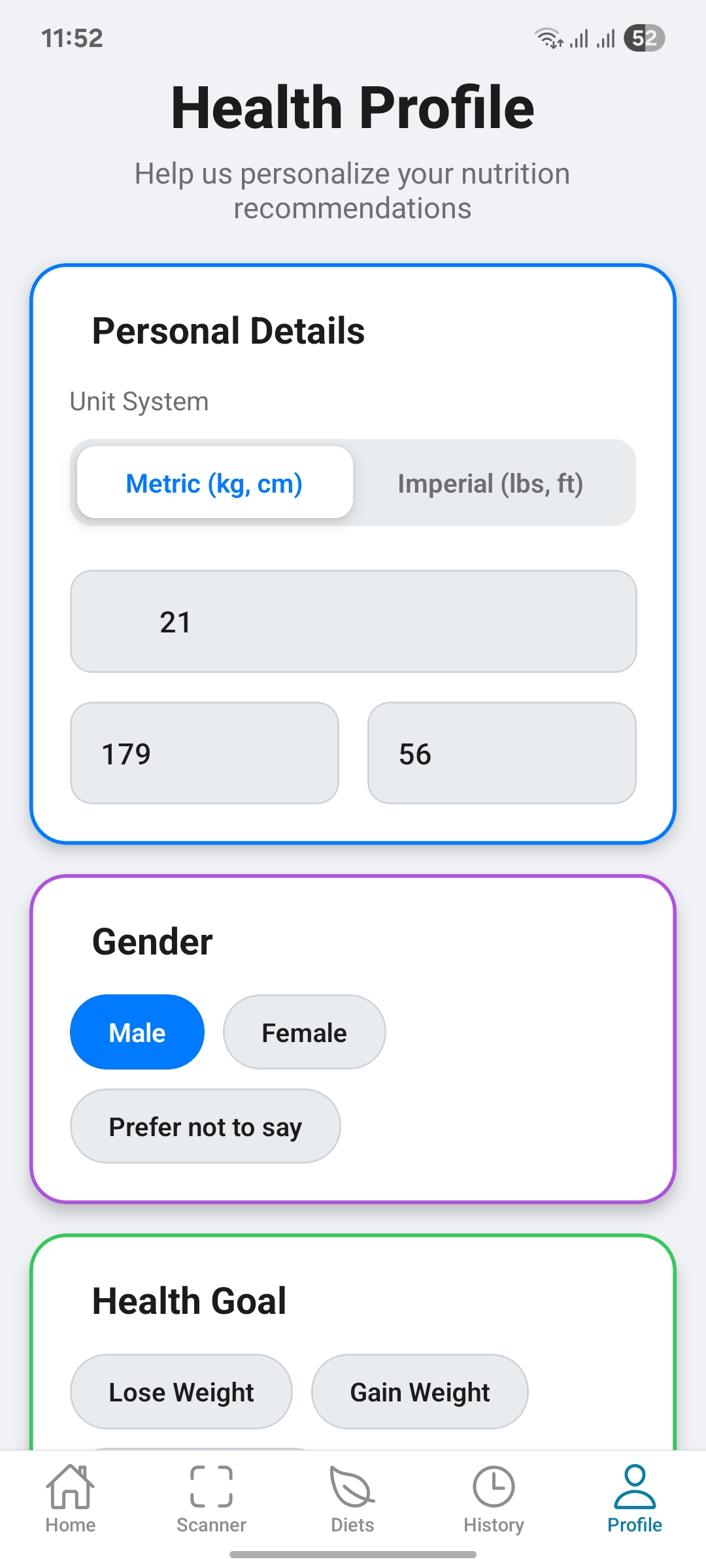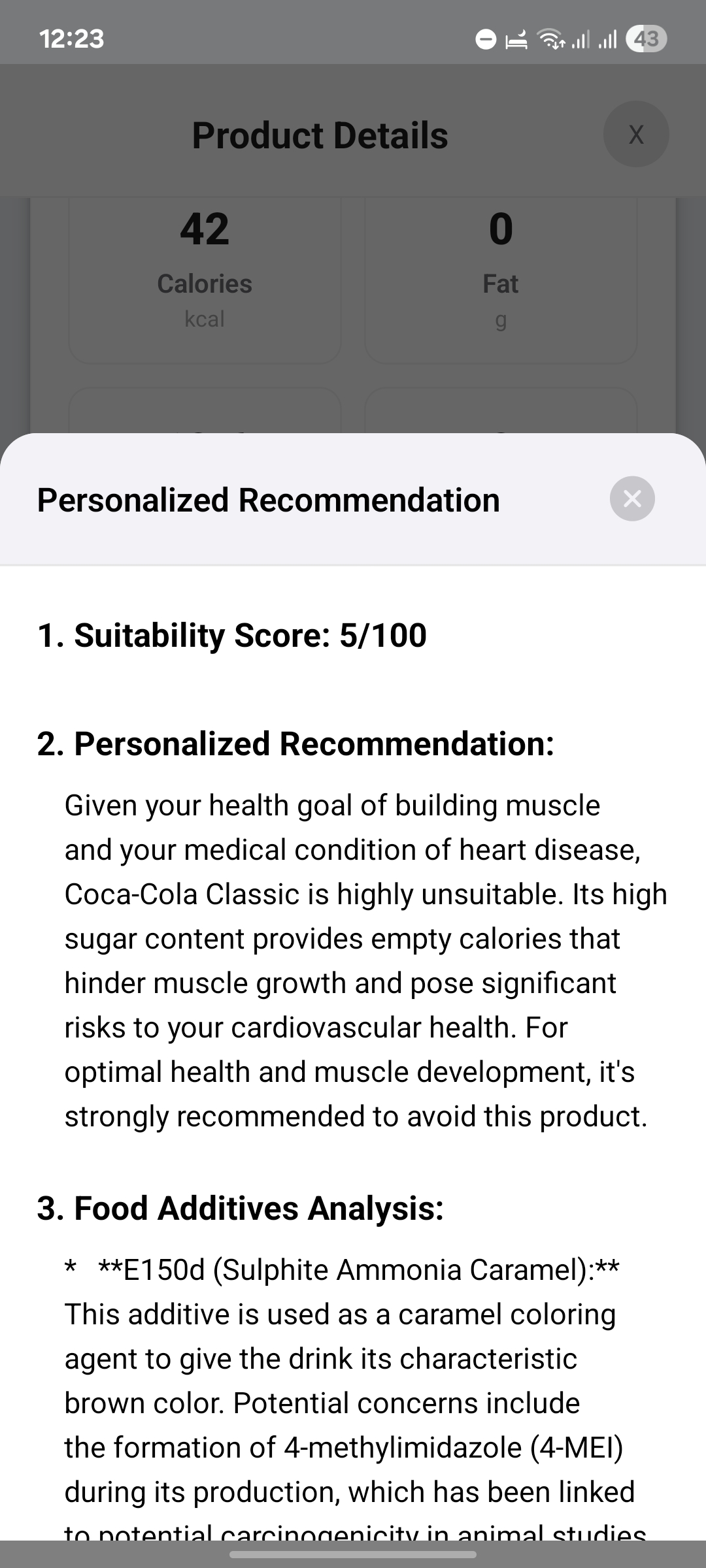 - Hyper-Personalized Suitability Score: Scan any product barcode. Our AI instantly delivers a Suitability Score (0-100) and a clear warning, not based on generic standards, but on your specific allergies, chronic conditions (e.g., Diabetes), and diet goals.
