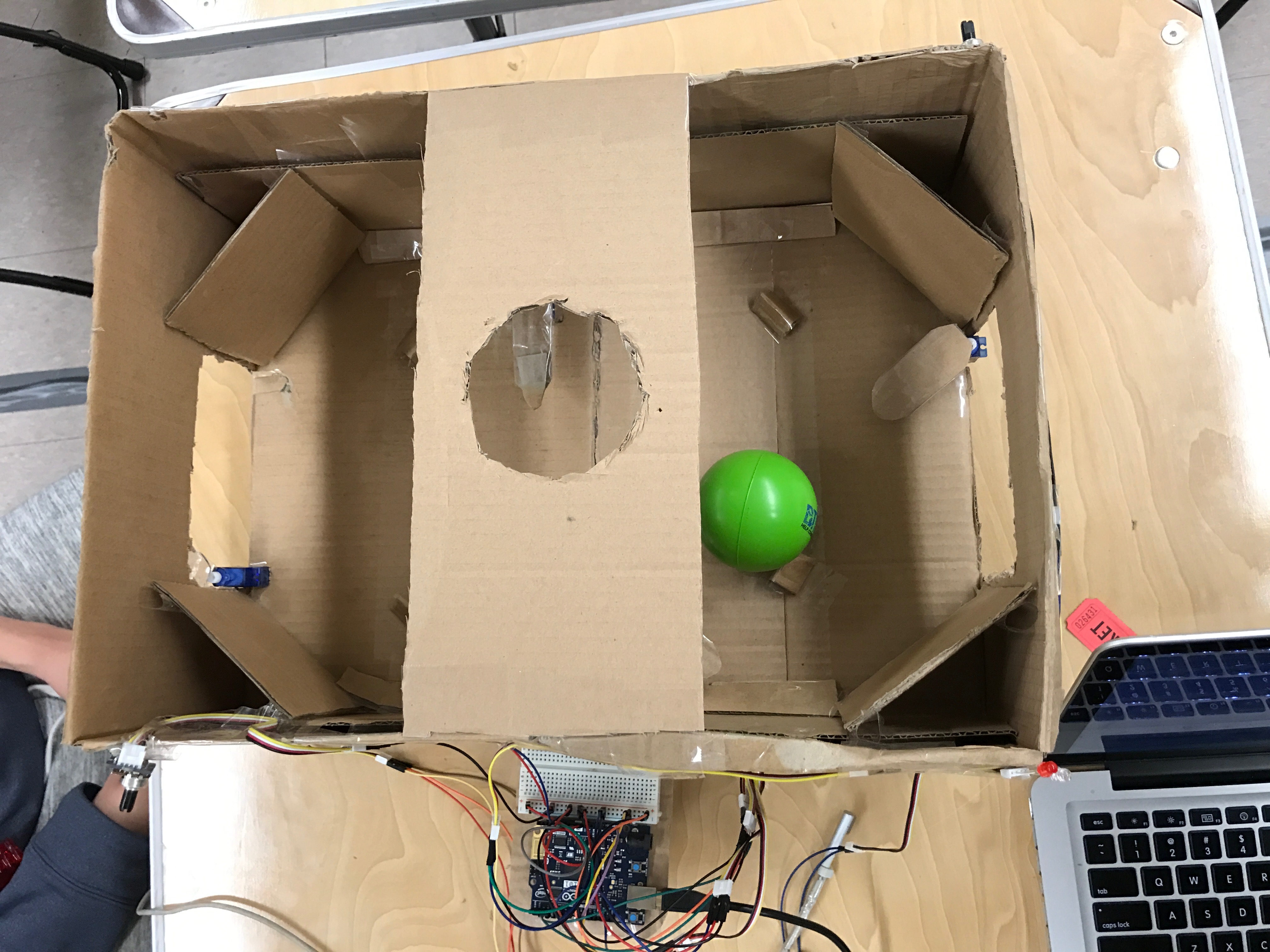 Our resources were limited, and so we combined the ability of four Computer Engineers to construct this arcade game from Arduino, stepper motors, potentiometers, cardboard, and tape.