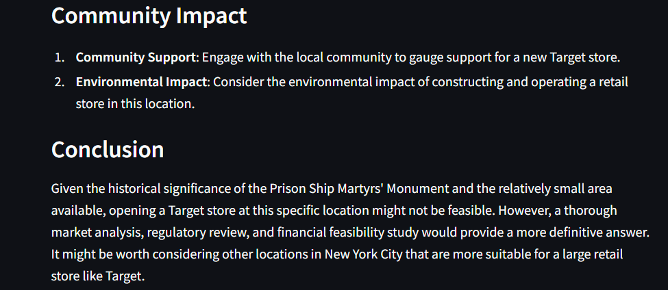 In the future, I plan to enhance the app by adding more advanced analytics and visualization features. I also aim to improve the accuracy and relevance of the insights generated by Mistral LLM. Additionally, I want to explore integrating more data sources to provide even more comprehensive analysis for retailers. Finally, I plan to conduct more experiments with TruLens to further optimize the search performance and provide the best possible recommendations for store locations.