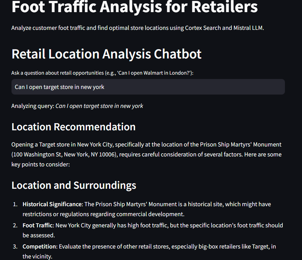 The project analyzes customer foot traffic and provides recommendations for optimal store locations. It uses Cortex Search to retrieve relevant data, Mistral LLM to generate insights, and Streamlit for an interactive front-end interface. Additionally, TruLens is used to measure and optimize the search performance.