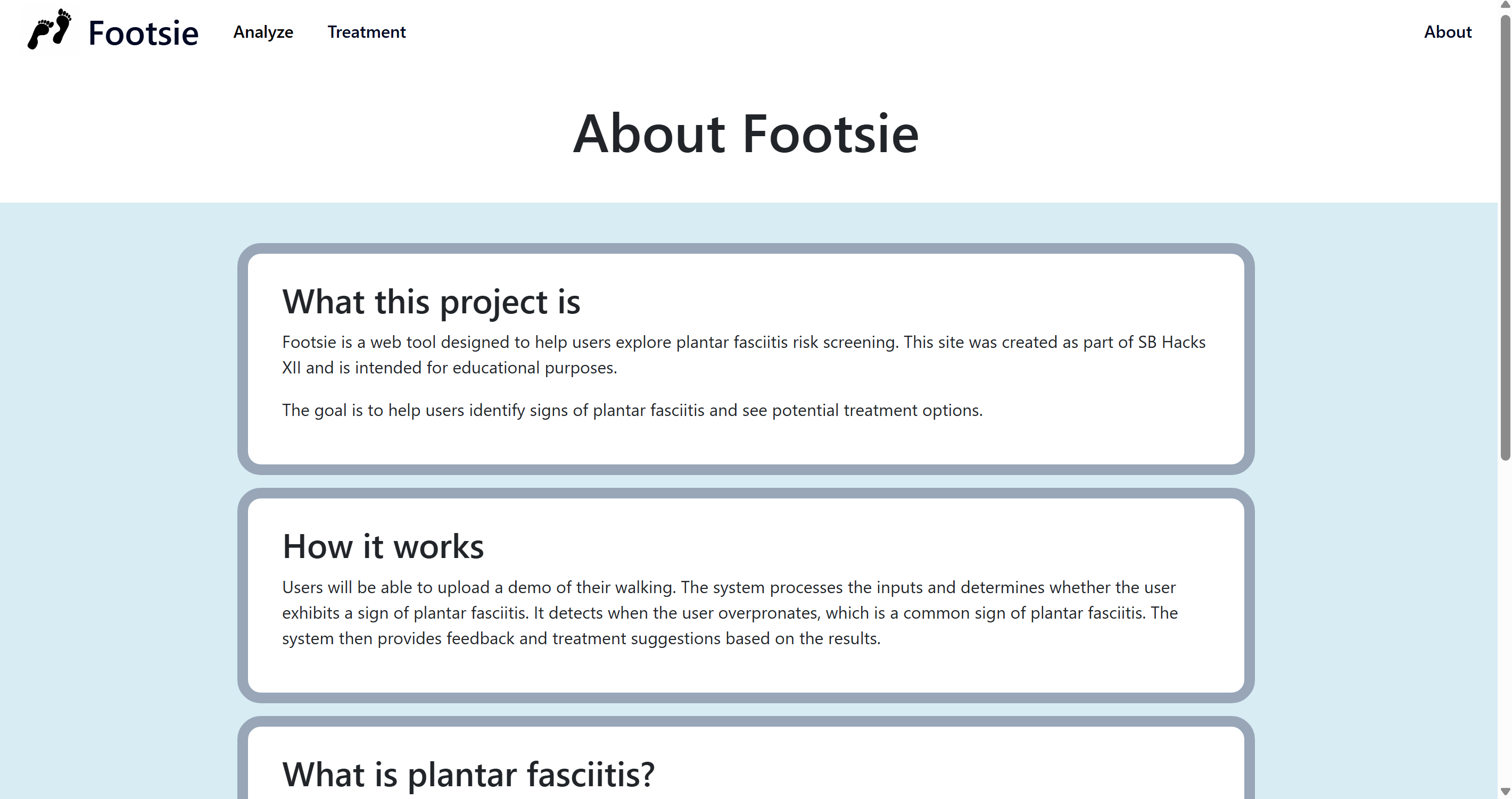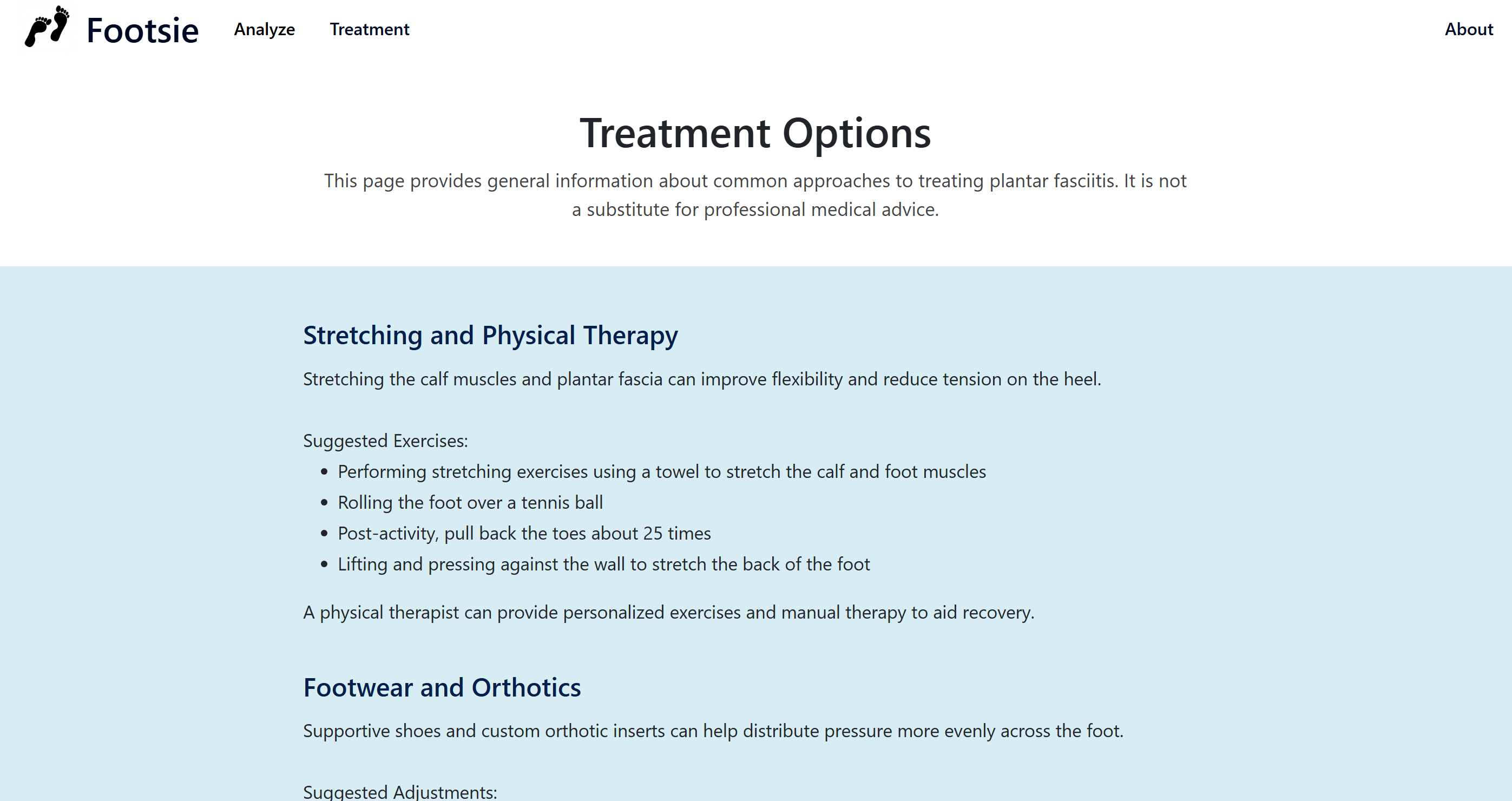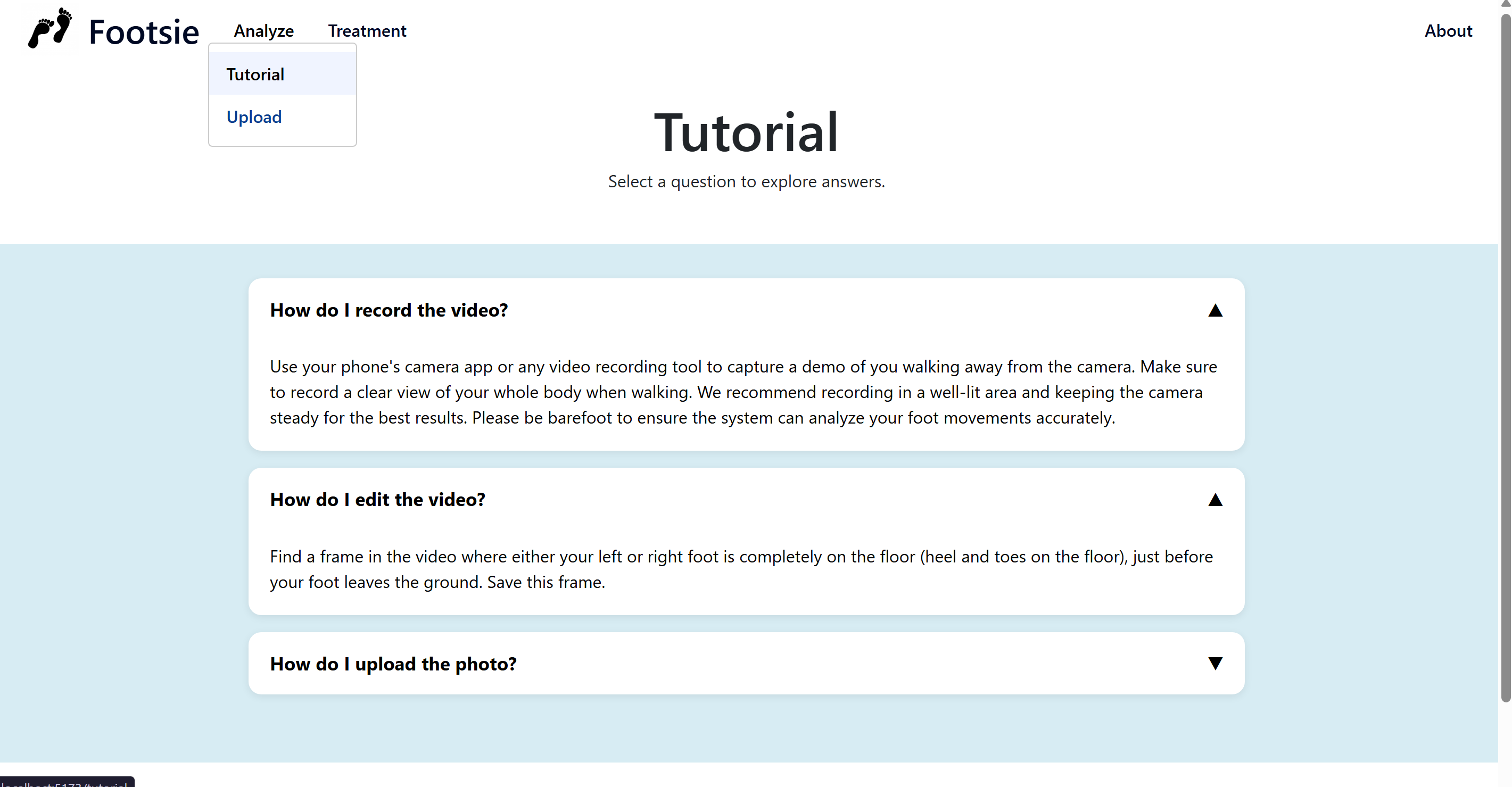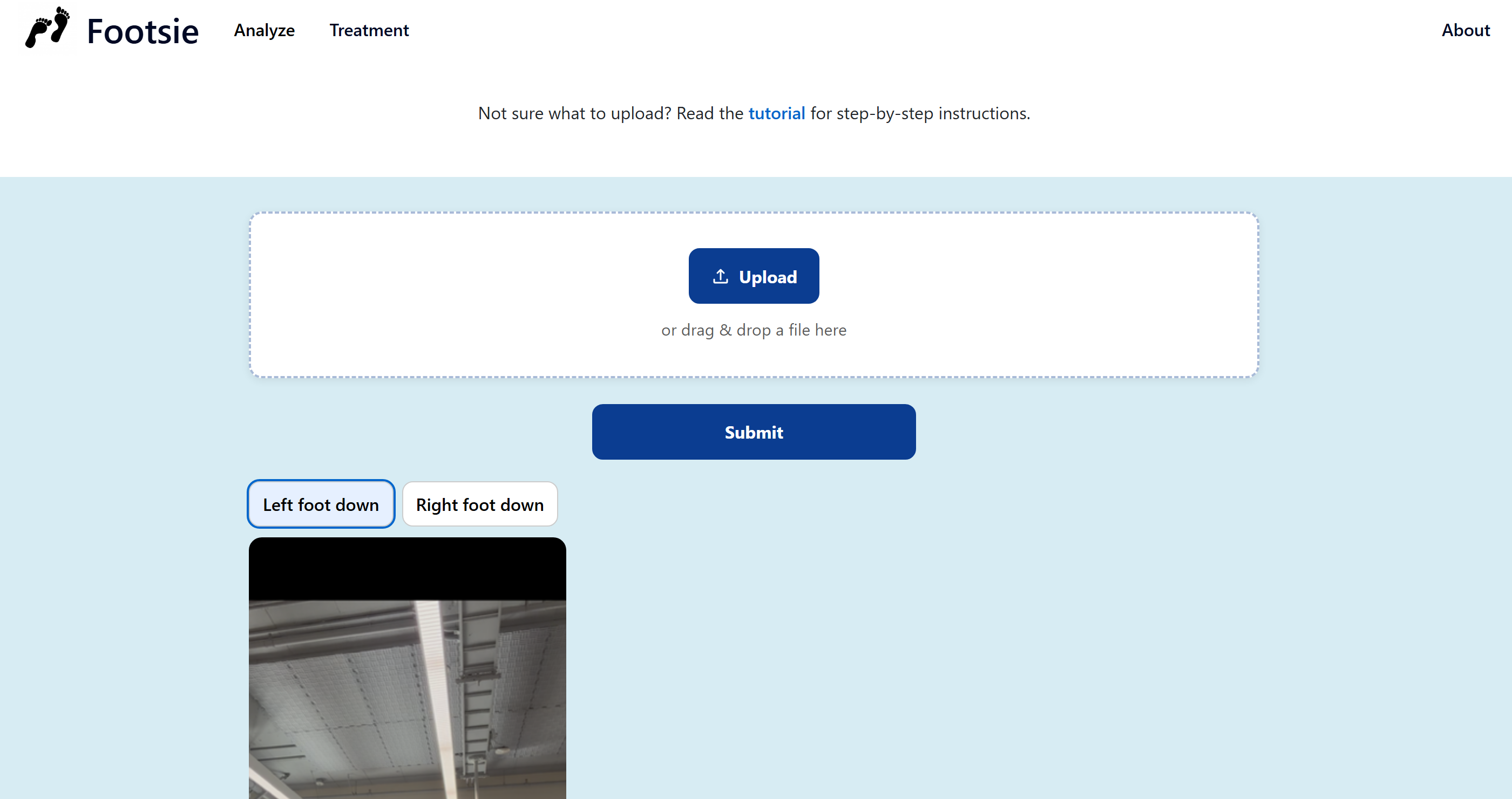 Our Website asks users to video themselves walking. The users then take this video and find the exact frame of when the foot is maximally on the ground (the heel and toes fully lie flat on the ground). The users then take this frame (picture essentially) and submit that to the Footsies website which then outputs if the foot is pronated or not. Depending on the output, the website then prompts the user to a treatment page.
