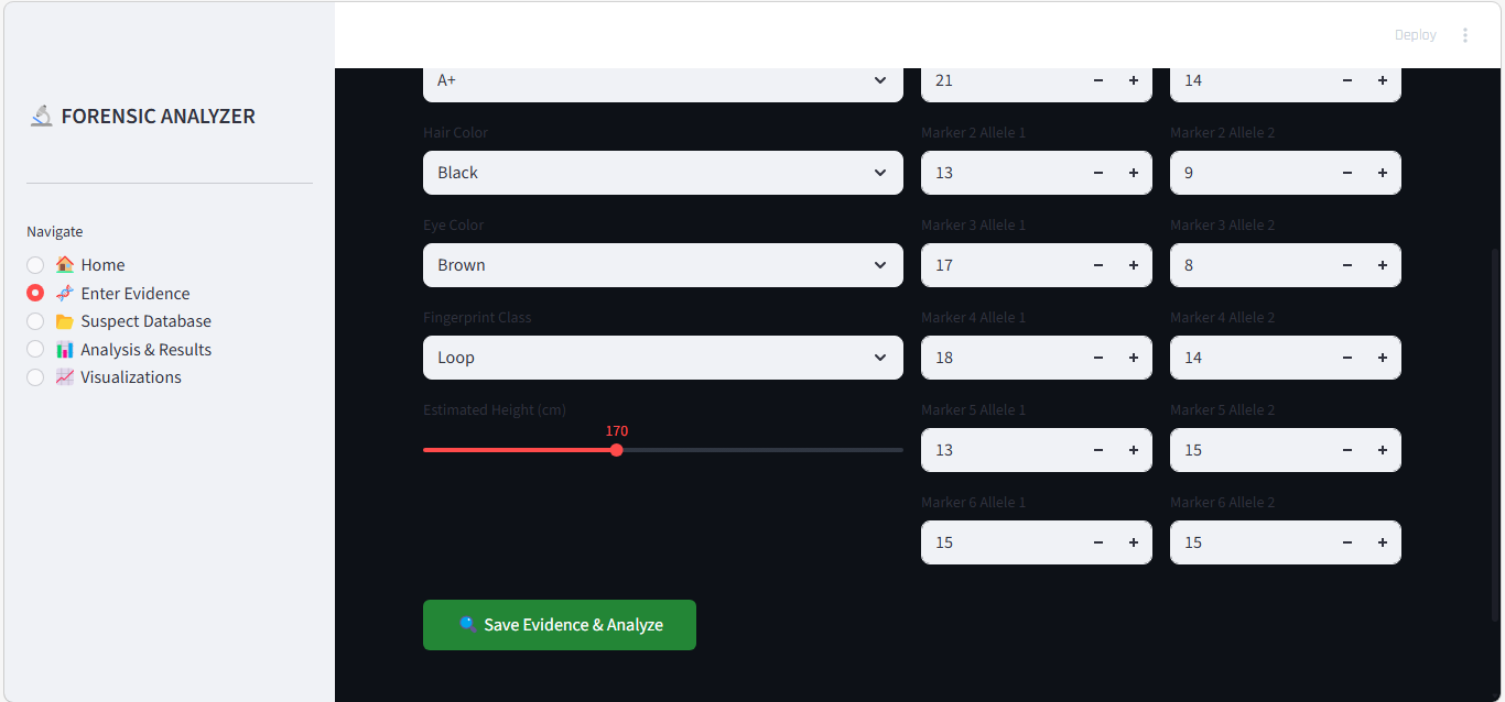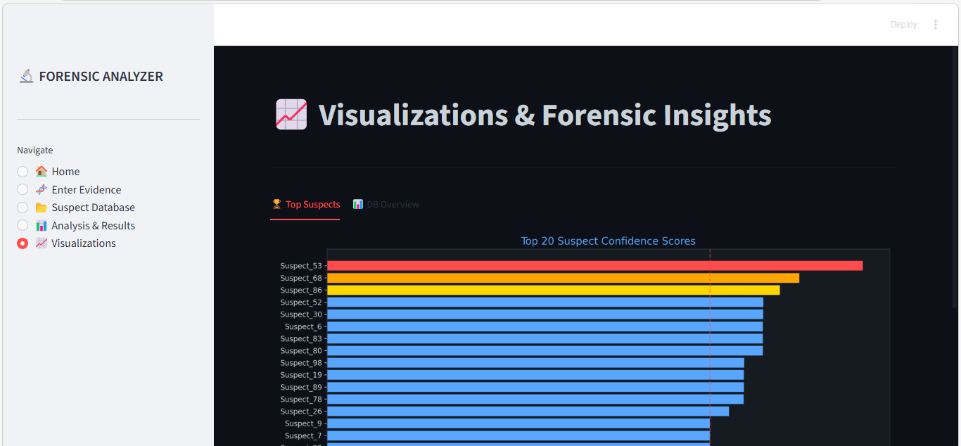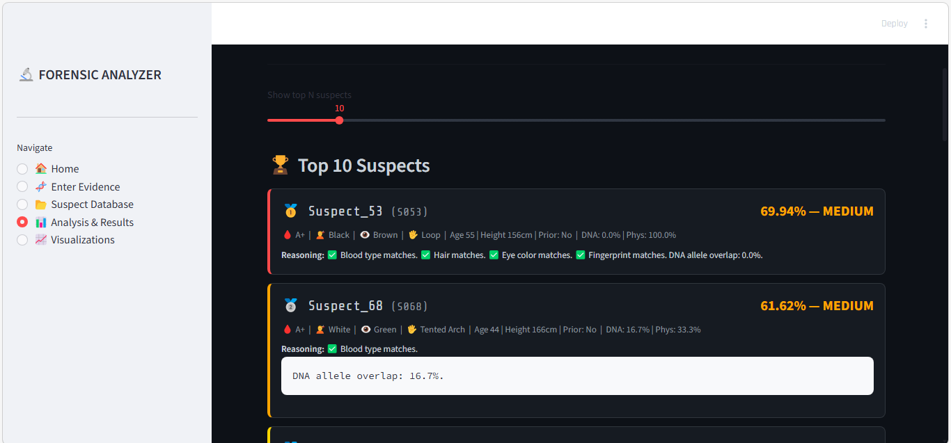 - Balancing the three scoring components (ML + DNA + physical) to produce confidence scores that felt forensically meaningful
