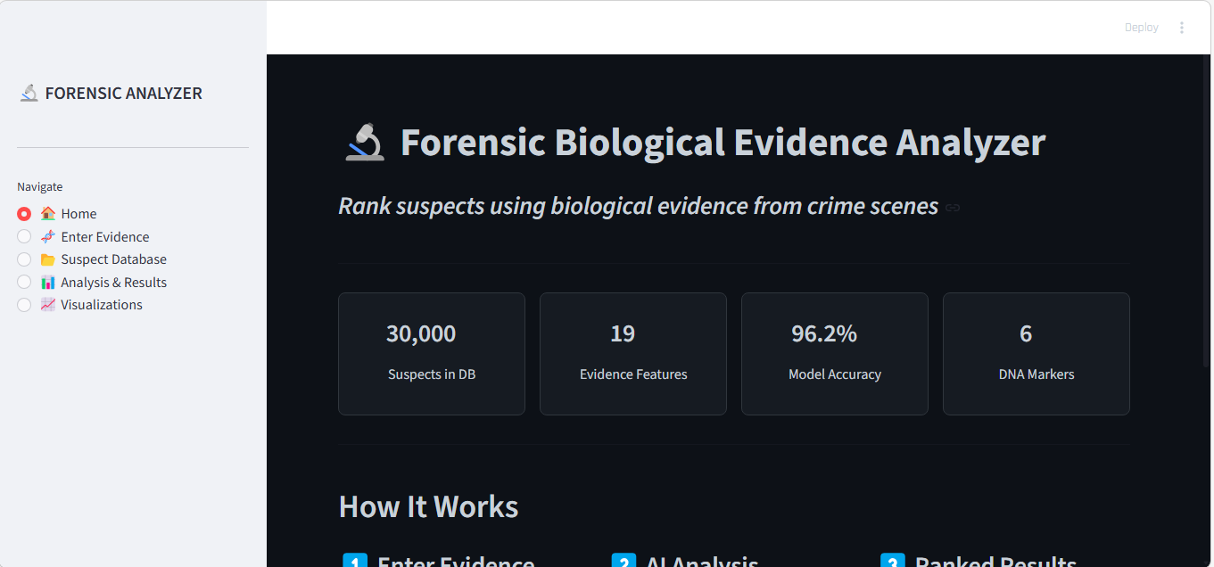Forensic investigations are slow, manual, and prone to human bias. When biological evidence is collected from a crime scene, detectives often have to sift through thousands of records by hand. We asked — what if machine learning could do that instantly, transparently, and at scale? That question inspired the Forensic Biological Evidence Analyzer.