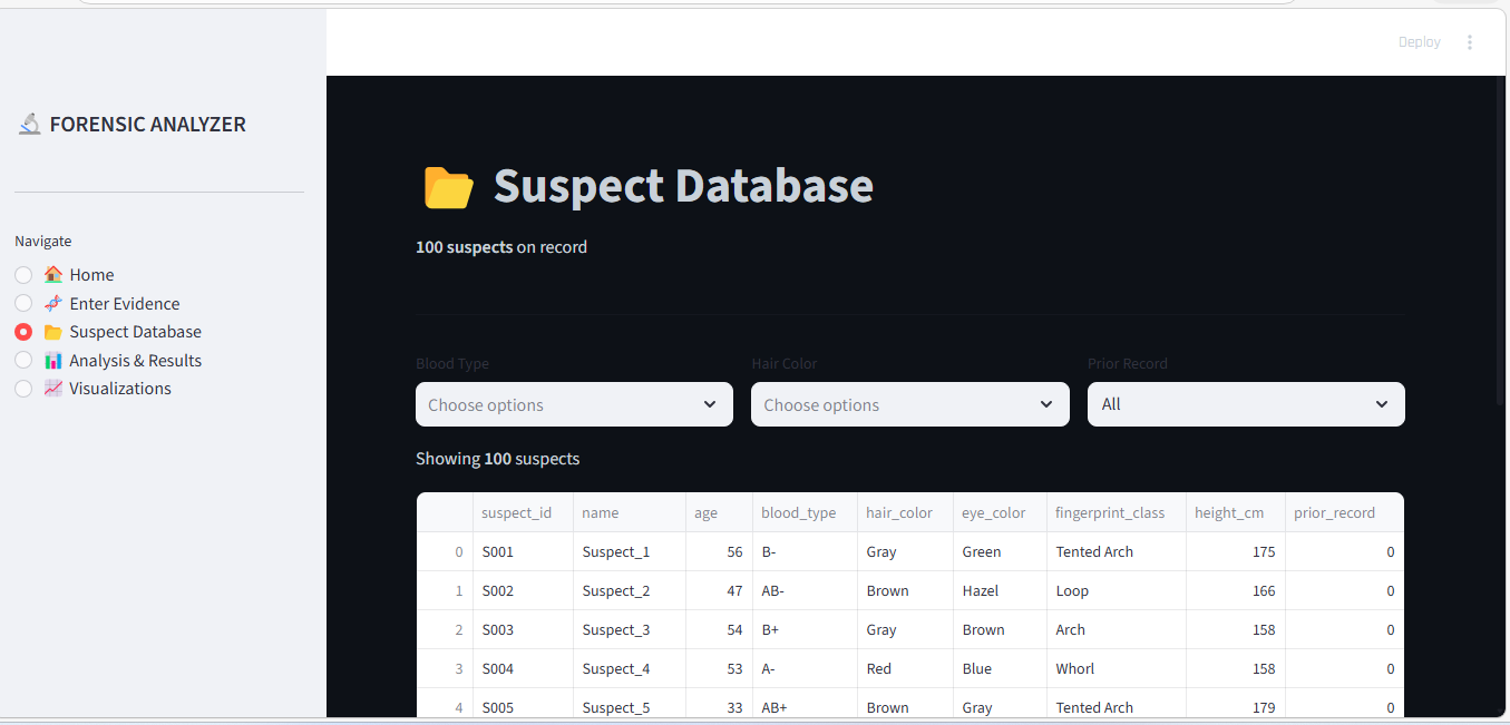 Our system takes biological evidence collected from a crime scene — blood type, hair color, eye color, fingerprint class, and 6 DNA STR markers — and runs it against a database of 30,000 suspects using a trained Gradient Boosting ML model. It outputs a ranked list of suspects with confidence scores and written reasoning for every match. The system models uncertainty rather than claiming one correct answer — exactly how real forensic science works.