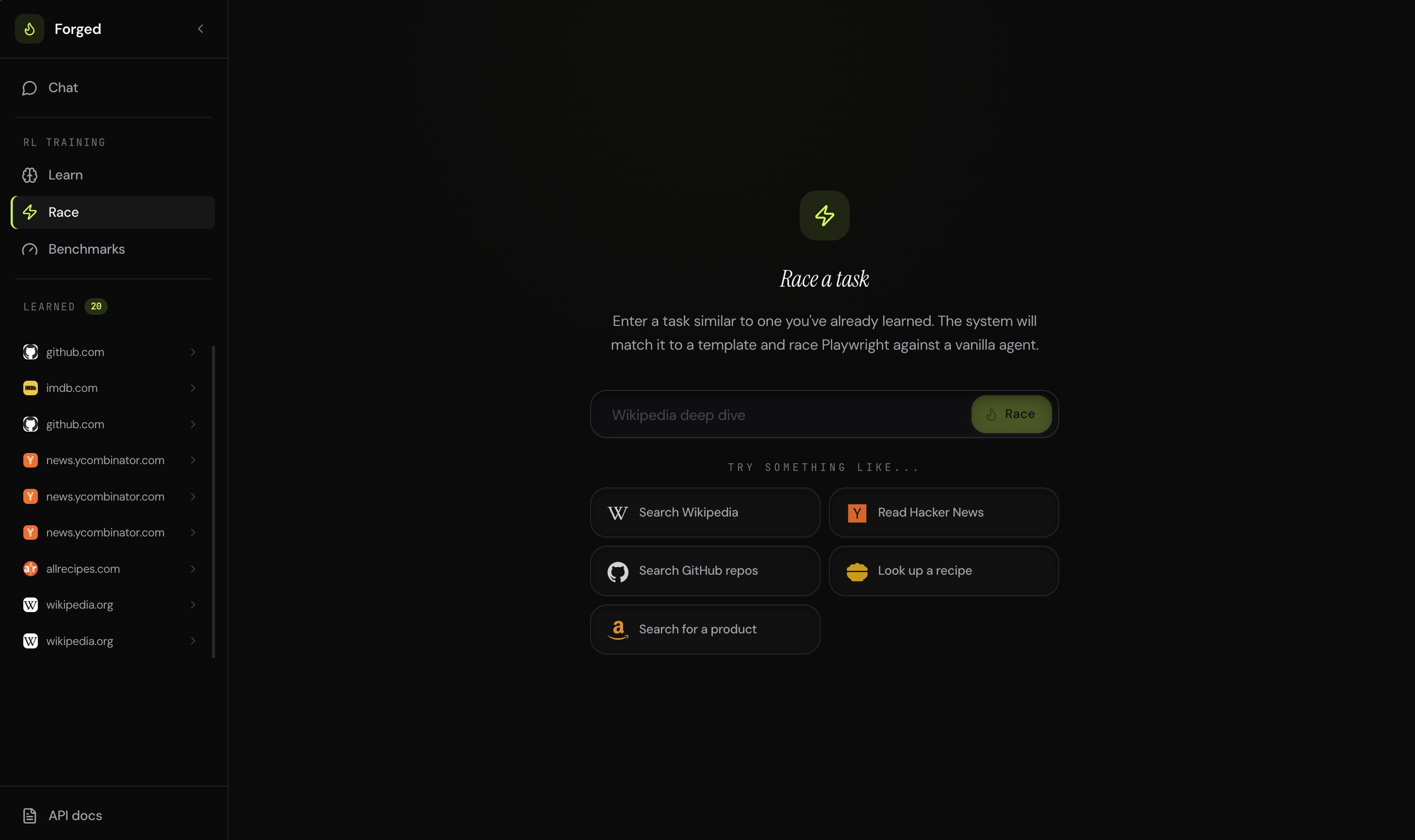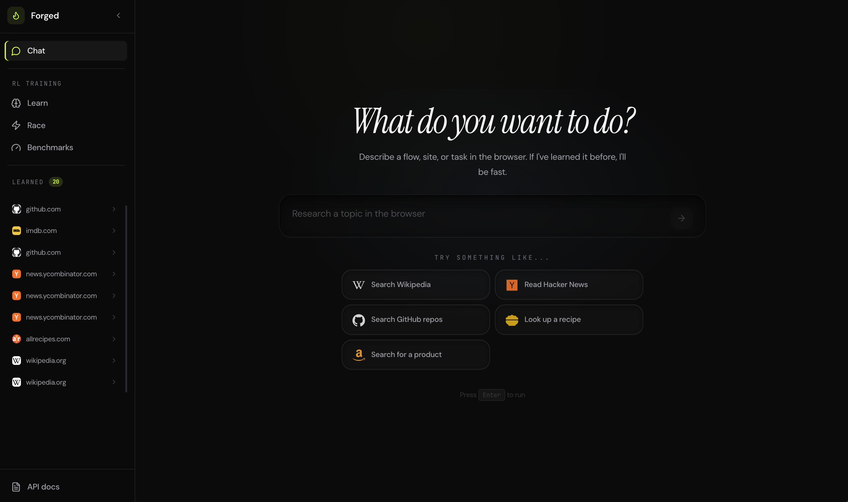 Forged exposes an MCP server. Plug it into Claude Code, Cursor, or any MCP-compatible tool. Your coding agent calls forged_browse to run browser tasks at template speed. Skills learned in one session carry over.
