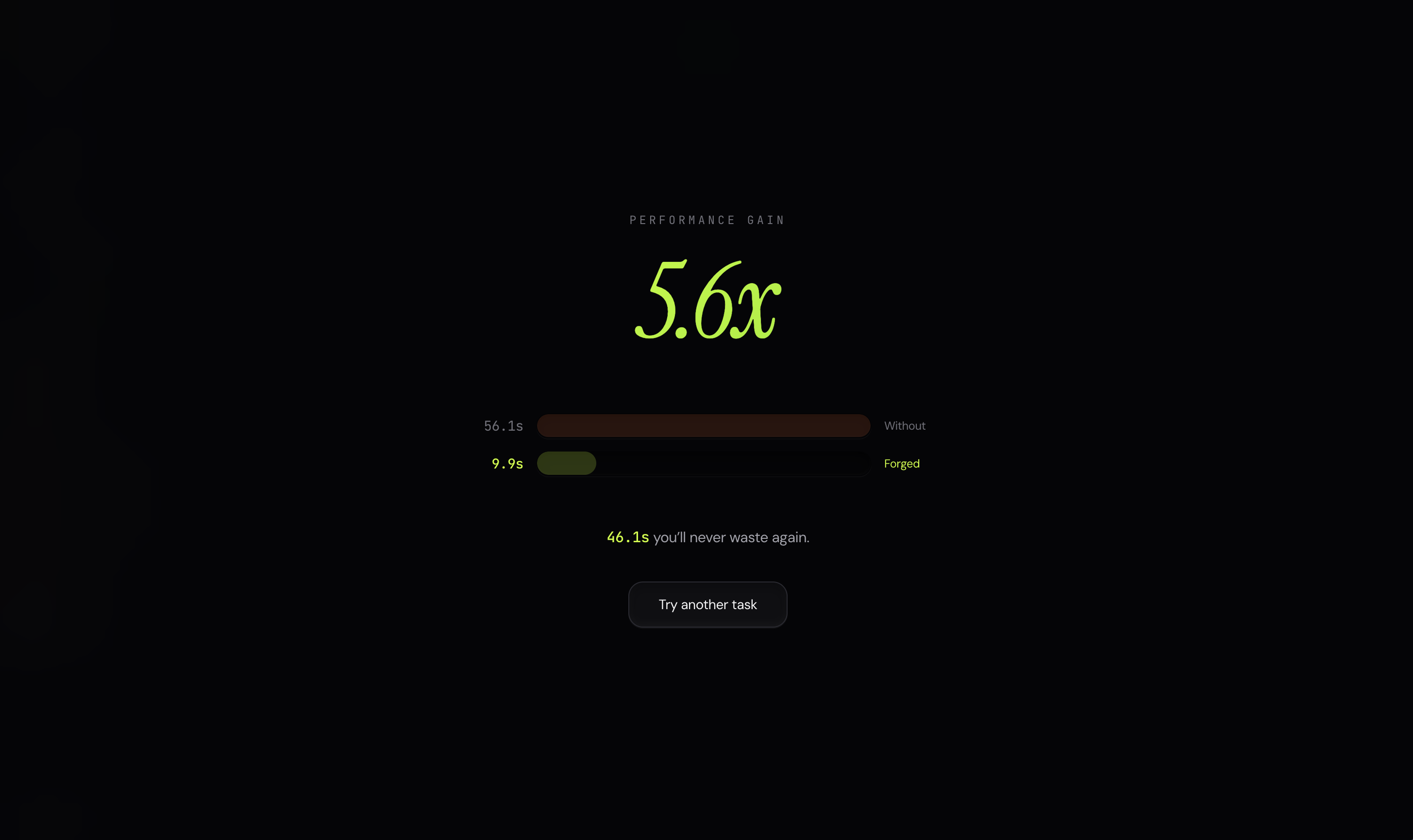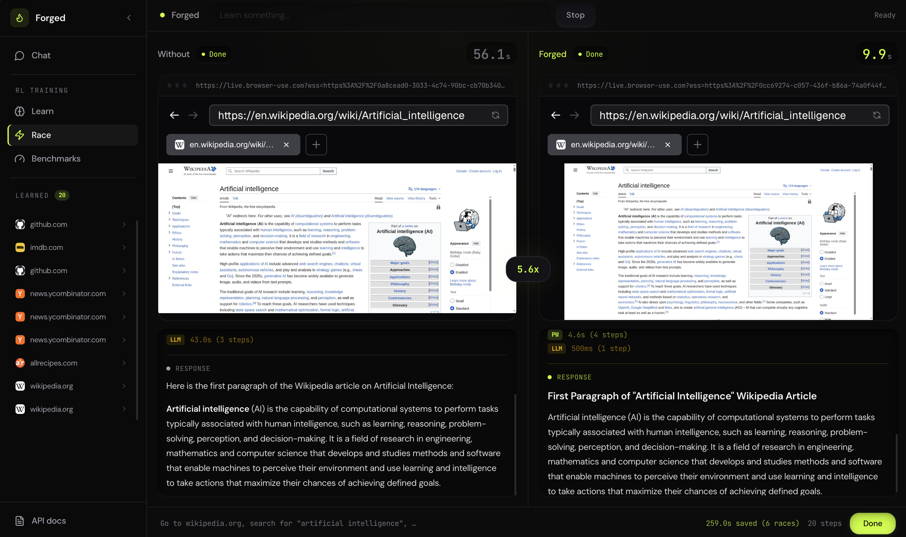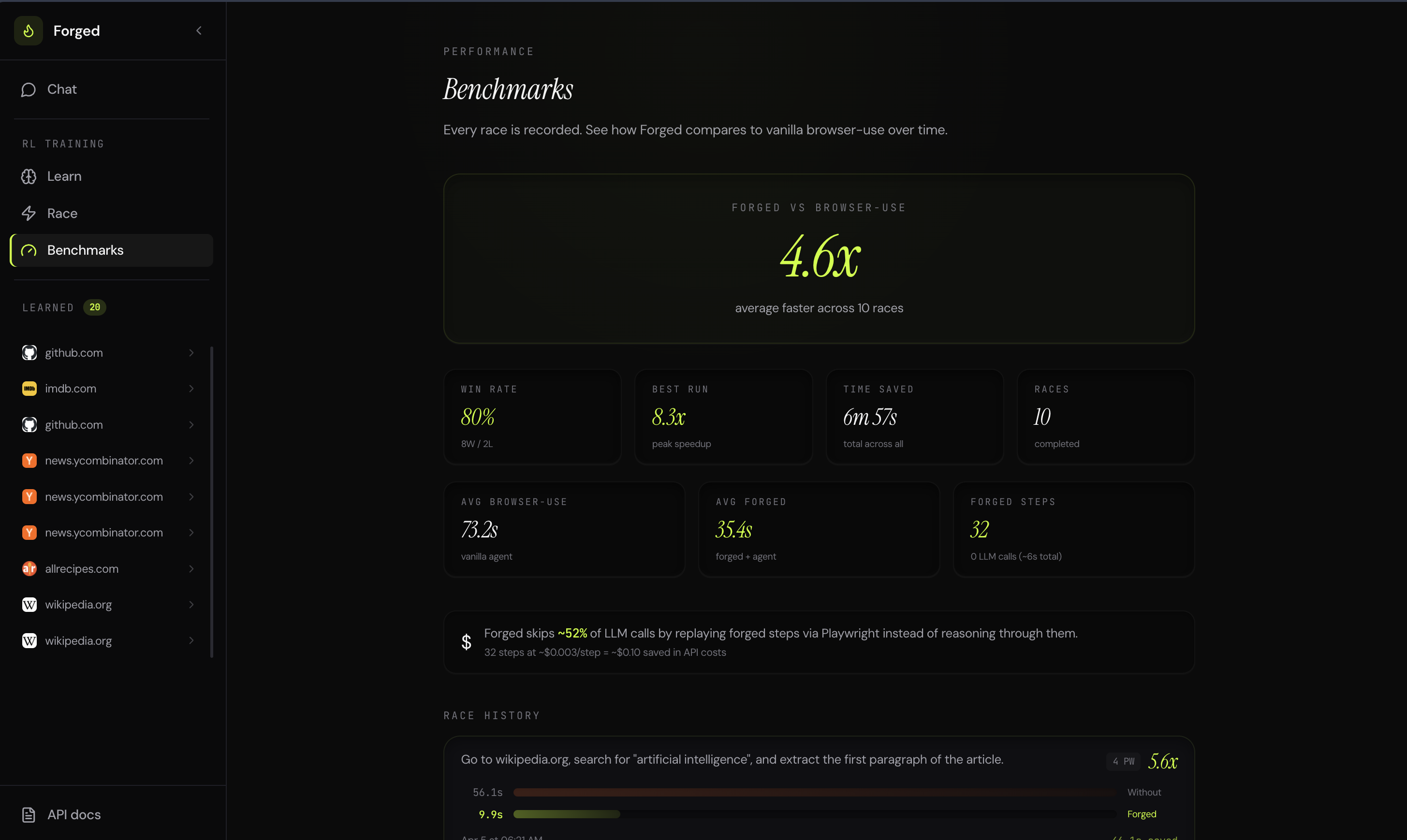 Wikipedia search: vanilla agent 82s, Forged 11s. Same answer. 7x faster. Fraction of the tokens.