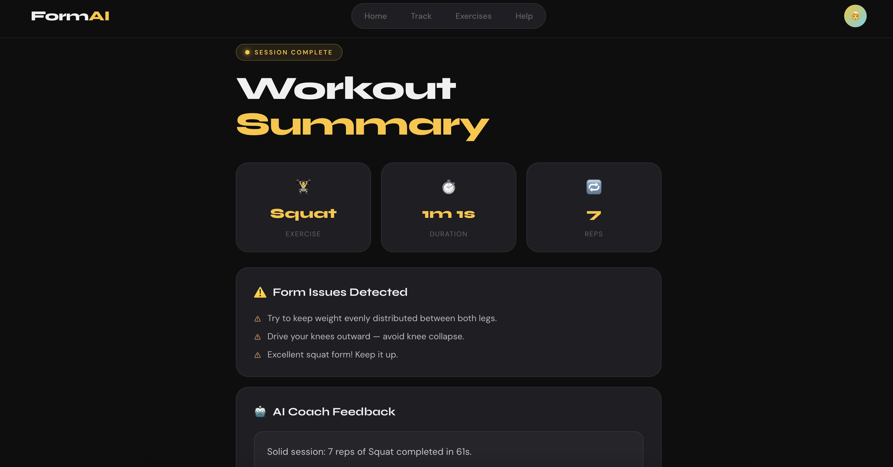- A clean full-stack pipeline from the webcam stream → angle detection → workout session summary → LLM coached feedback → aesthetically pleasing UI cards