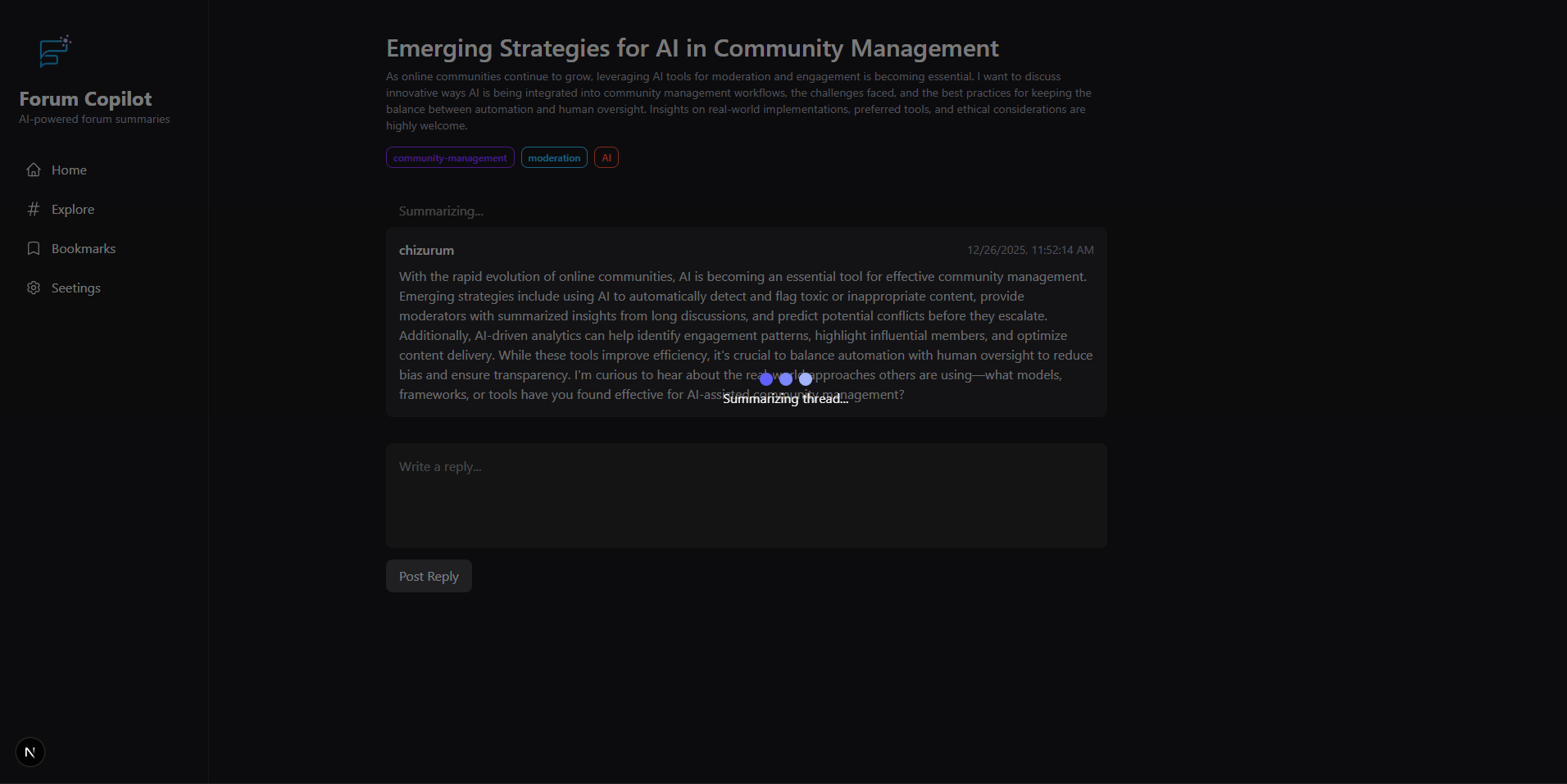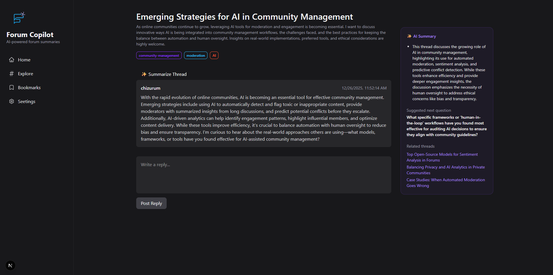 Forum Copilot is an AI-powered assistant for forums. Given a thread, it can: