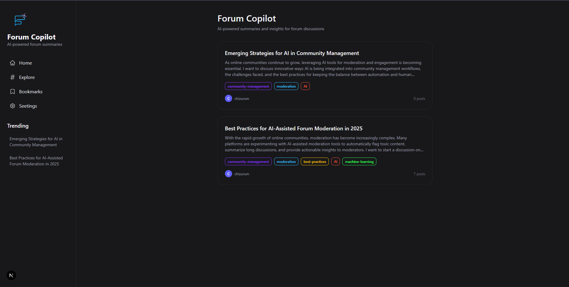 - UX: Thread cards, post view, and AI summary component designed for clarity on dark theme