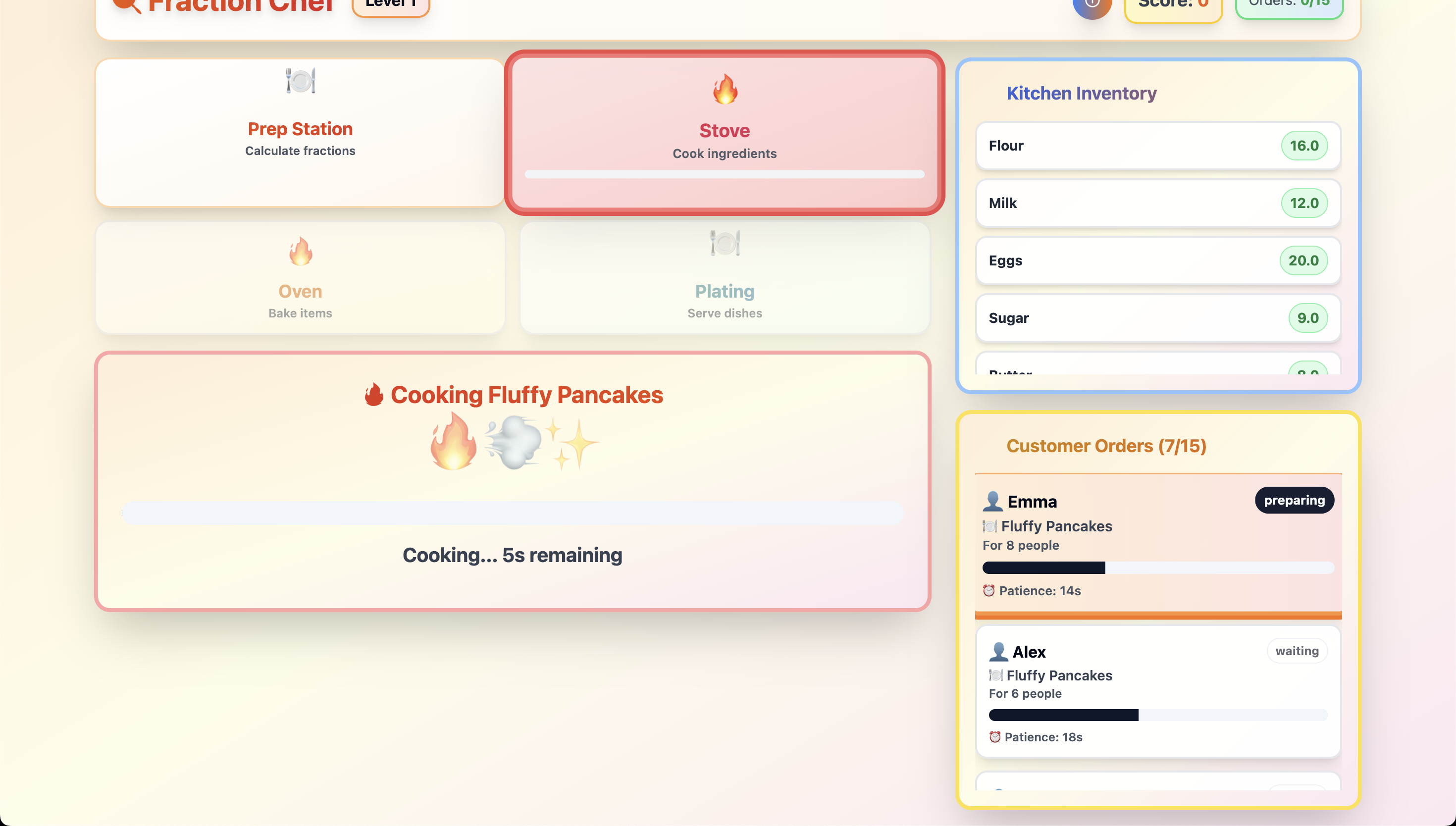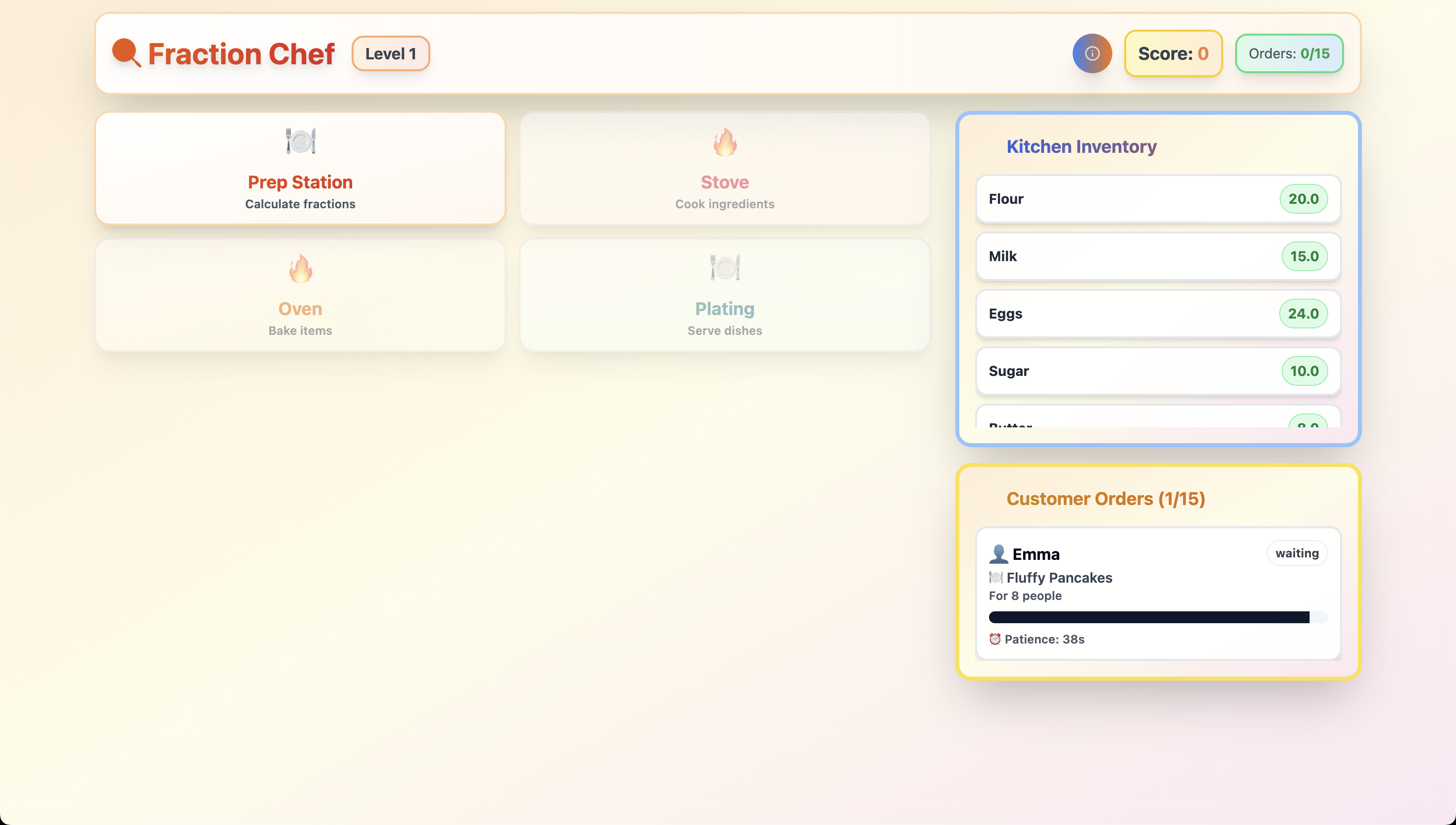 Fraction Chef transforms fraction learning into an exciting restaurant management game. Players receive customer orders with different serving sizes and must calculate the correct ingredient amounts using fraction multiplication. They progress through prep, cooking, and plating stations while managing time and inventory.