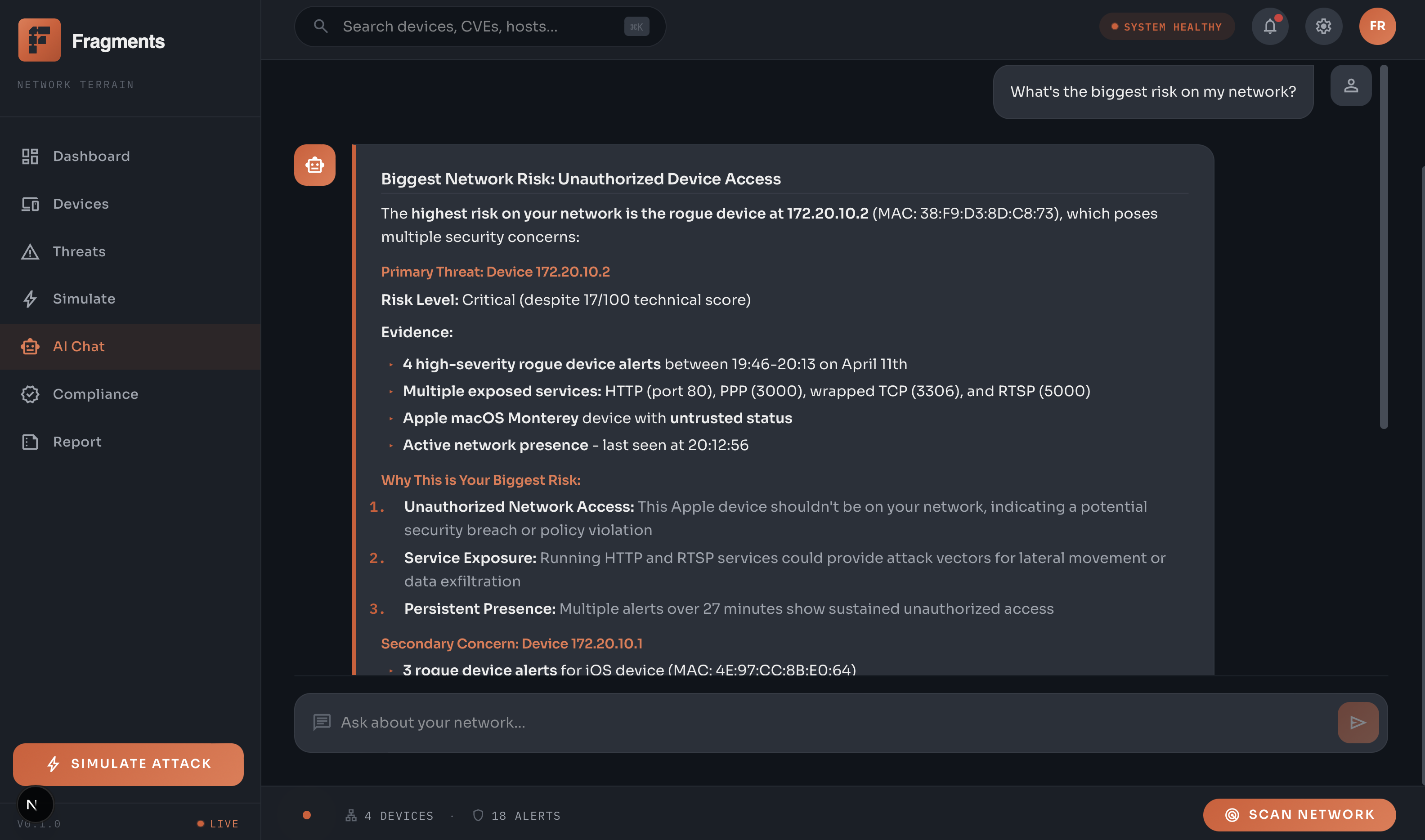 On top of that, Fragments includes an AI layer that allows users to ask questions about their network in natural language and receive evidence-backed answers, turning raw scan data into meaningful insight.