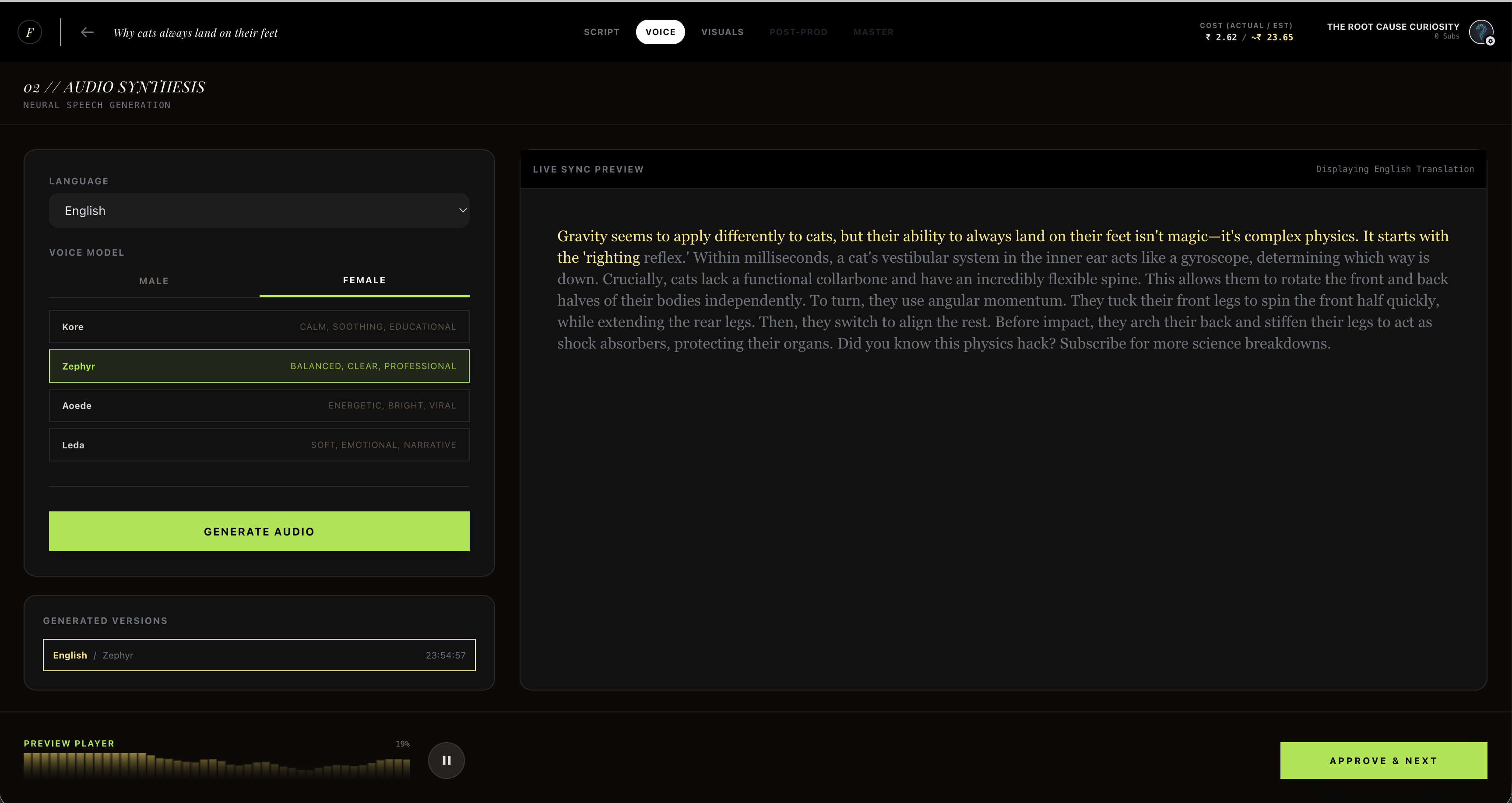 - Process: Uses Gemini 3 Pro to write a script with specific timing constraints. It creates a Hook, Body, and CTA.