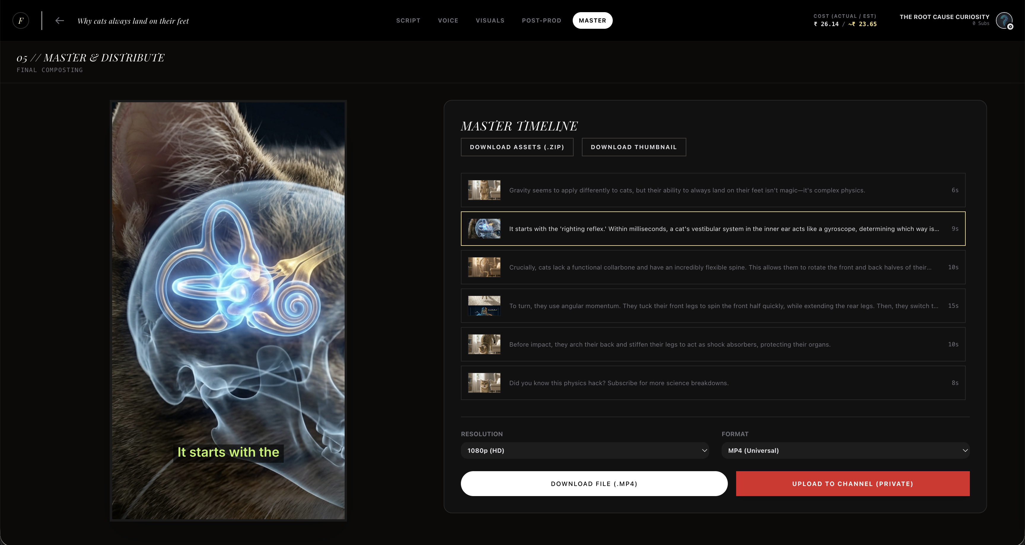 - Distribution: Compiles assets and uploads directly to YouTube as a private draft.