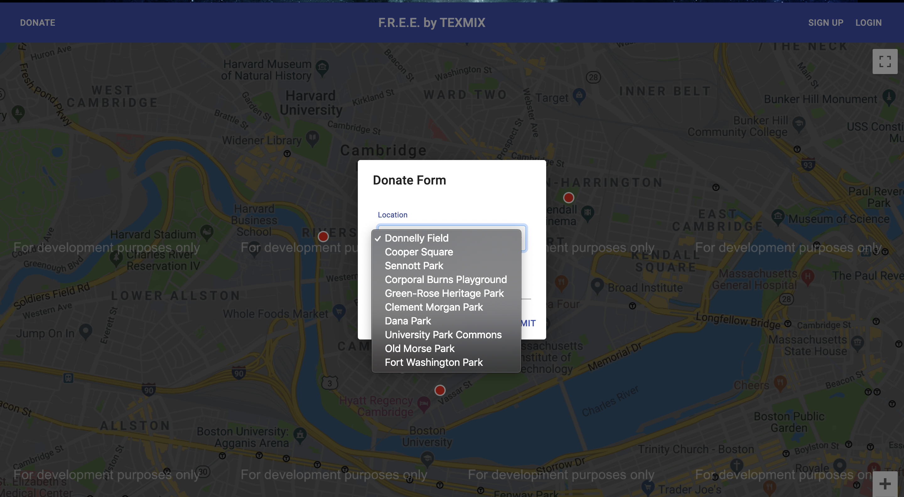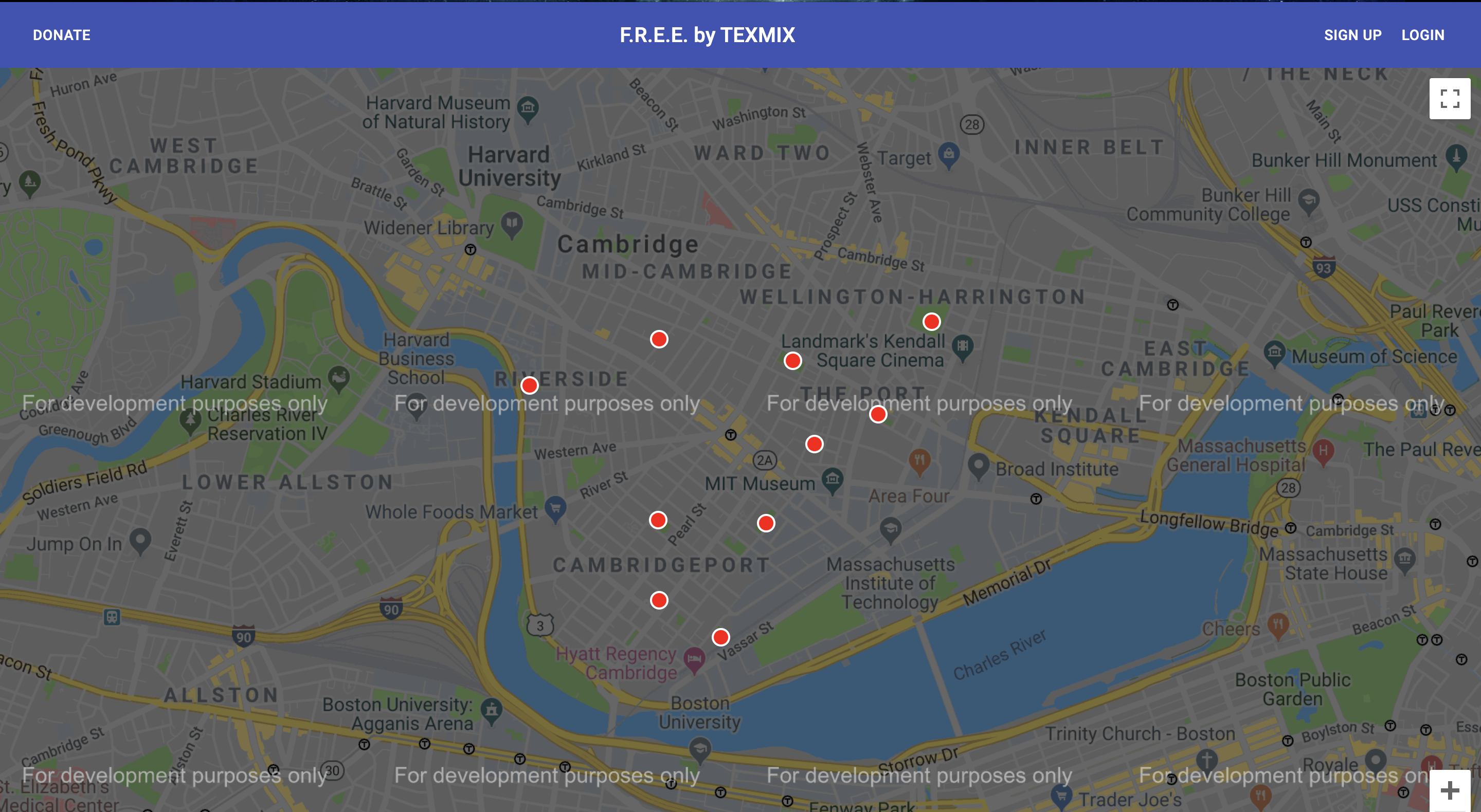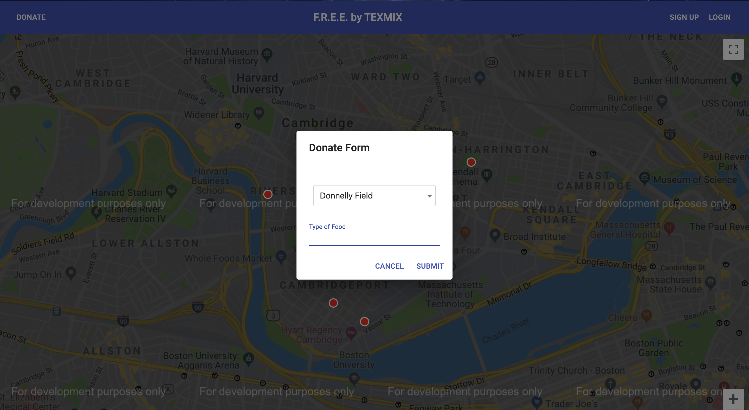 FREE(Food Distribution Effort for Everyone) is composed of three components: a web application, a network of interactive kiosks, and a cluster of computer-vision enabled cameras. The web application allows any vetted user to deposit food at any of our designated drop-off/pick-up stations(kiosks). The current implementation allows a user to donate and deposit food at any of the 10 drop-off stations in the Cambridge, Massachusetts area. This information is then sent to the kiosk(s) in the area, which displays live information about the food stations in its’ zone. Each station is represented by an RGB LED that changes color on a spectrum from red to green, giving quick information about which stations have more food than others. More in-depth information is displayed on an information panel at the bottom. When a user wants to get food from a station, they only need to tap on the station that they desire. Currently, only stations 1-5 have touch support due to a lack of available hardware. Lastly, the kiosks automatically enter standby mode when the user walks away to save power. The computer-vision enabled cameras, which have not been fully implemented, will recognize when a particular type of food is placed in a food station, automatically send that information to the kiosks, and give an approximate date of expiry for when the food needs to be removed from the station.