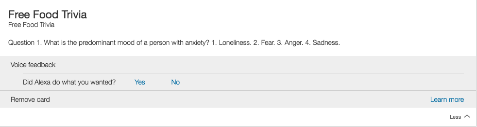 At its core, Free Food Trivia is just a trivia game that asks users a bunch of questions and declare the game won or lost based on the number of correct answers. The skill differentiates itself from other trivia skills by pledging to donate the entire revenue generated (through Amazon's developer incentives and in-skill purchases) towards the cause of eradicating world hunger.