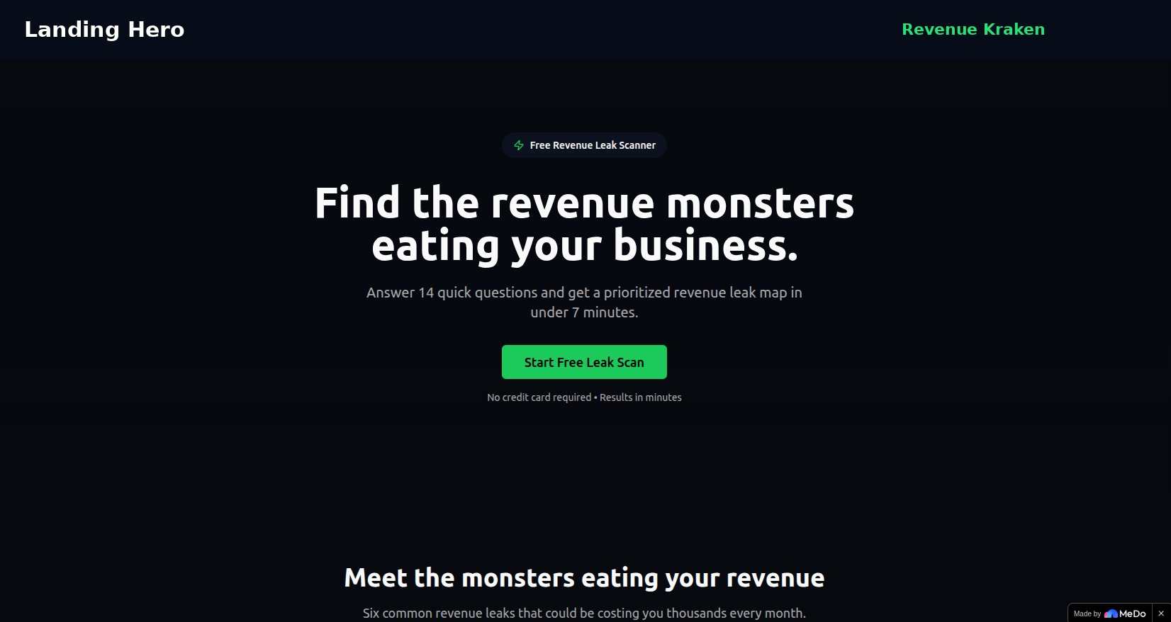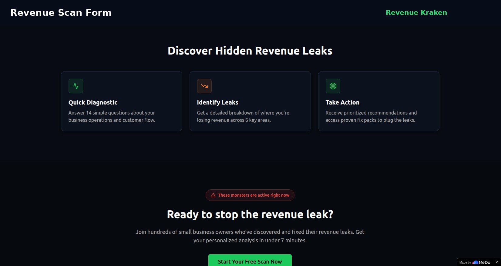 Revenue Kraken is a business diagnostic app that helps small businesses uncover the hidden “revenue monsters” eating their profits. Instead of giving owners another generic dashboard, it turns business problems into a fast, visual leak scan: slow lead response, checkout abandonment, no-shows, weak reviews, dead leads, and pricing issues.