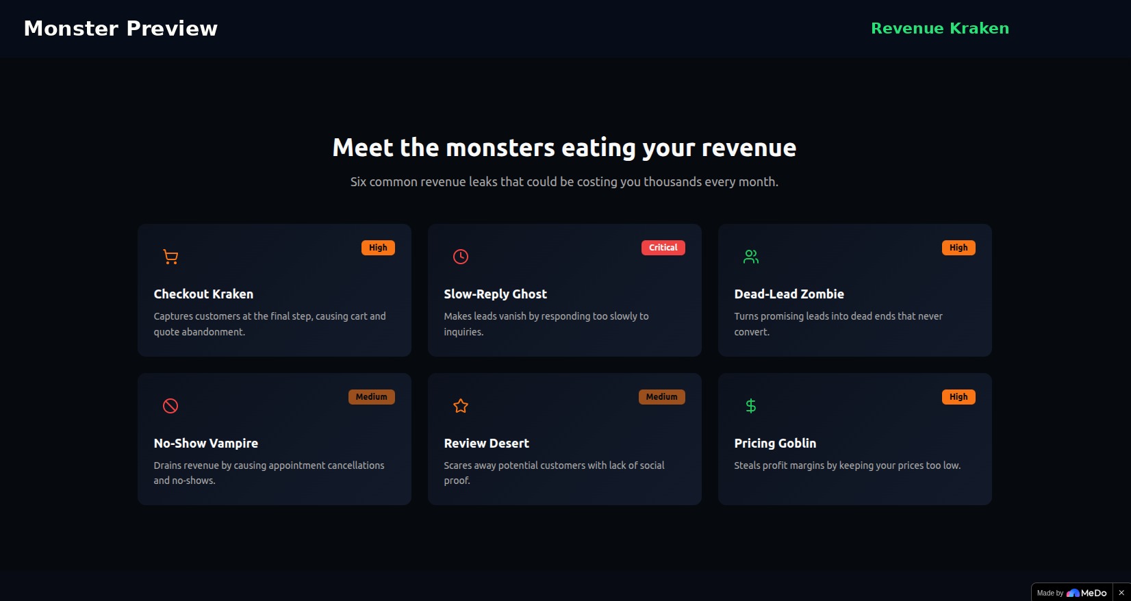 The monster concept made the app feel more memorable than a normal calculator. Instead of saying “your conversion rate is low,” the app identifies problems like Slow-Reply Ghost, Checkout Kraken, No-Show Vampire, and Review Desert. That made the product feel more like a business game plan than a spreadsheet.