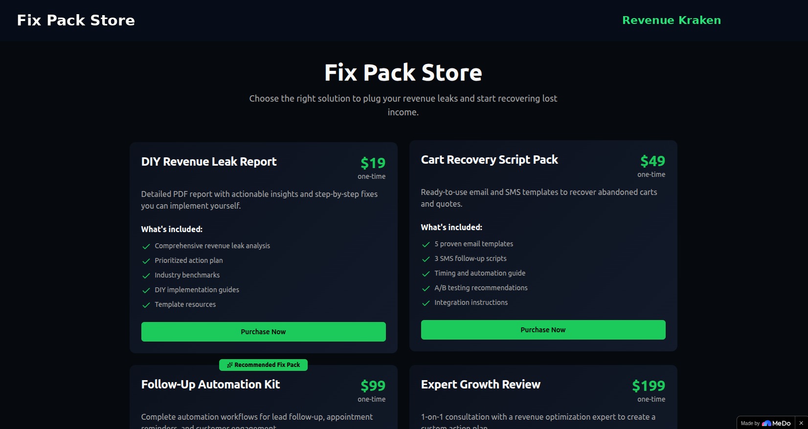 Revenue Kraken is not just a form, calculator, or dashboard. It is a revenue diagnosis funnel for small businesses. It captures business data, analyzes likely revenue leaks, ranks the most urgent problems, and points users toward practical fix packs.