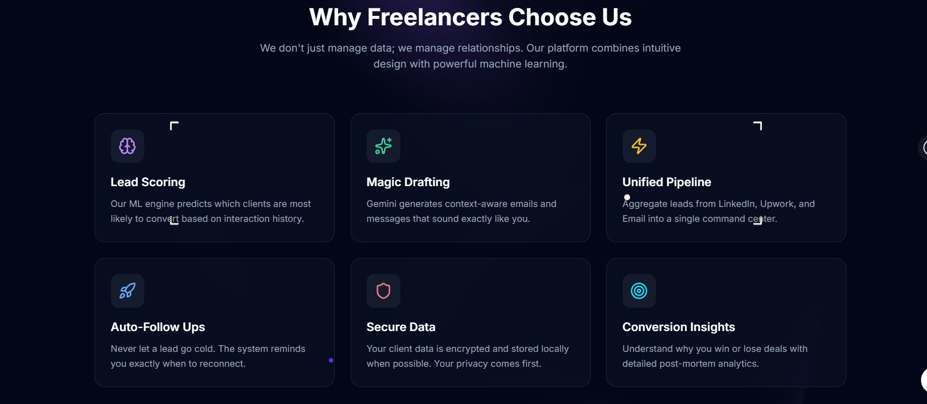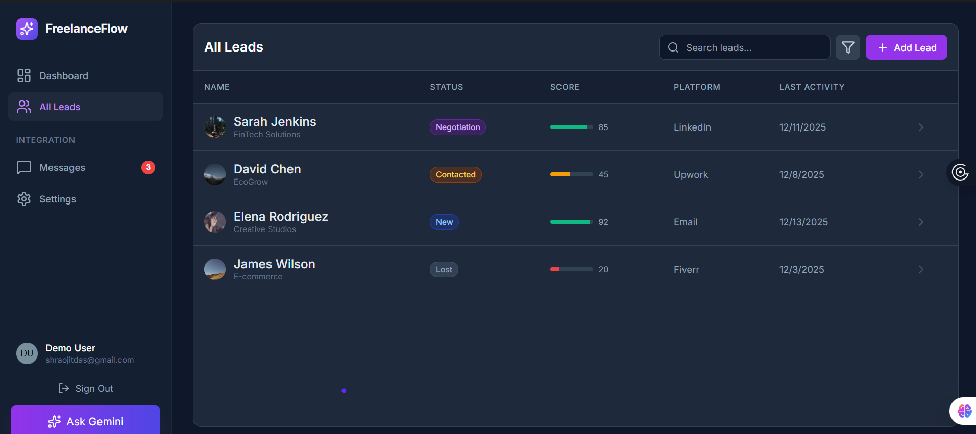 Freelancers struggle with: Leads scattered across multiple platforms No structured follow-up or prioritization system High cognitive load and emotional burnout Generic outreach messages with low conversion No learning loop from past wins and losses Existing tools are either too manual (CRMs) or too shallow (reminder apps). FreelanceFlow AI bridges this gap by combining deep data memory (MongoDB) with human-like reasoning and communication (Gemini AI).