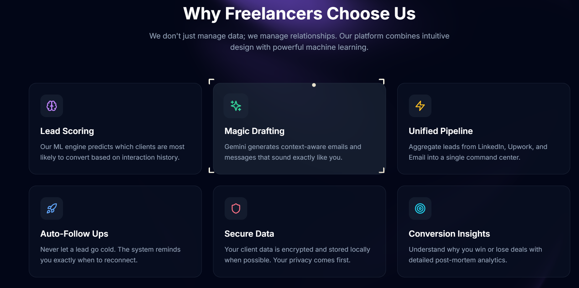 Project Description (Devpost Submission) Freelancers often lose potential clients not because they lack technical or creative skills, but because managing leads, follow-ups, and conversations across multiple platforms is cognitively exhausting and disorganized. Important context gets forgotten, follow-ups are missed, and outreach messages become generic and low-converting. FreelanceFlow AI is a web-based AI-powered relationship intelligence platform designed for solo freelancers, indie consultants/coaches, and early-career professionals who acquire leads through LinkedIn, Upwork, Fiverr, referrals, and email. Instead of functioning like a traditional CRM, FreelanceFlow AI behaves like a memory-driven decision system. It remembers every interaction, learns from outcomes, intelligently prioritizes leads, and assists freelancers in communicating clearly and confidently using AI. One-liner: FreelanceFlow AI is an AI relationship brain that remembers, prioritizes, and speaks for freelancers.
