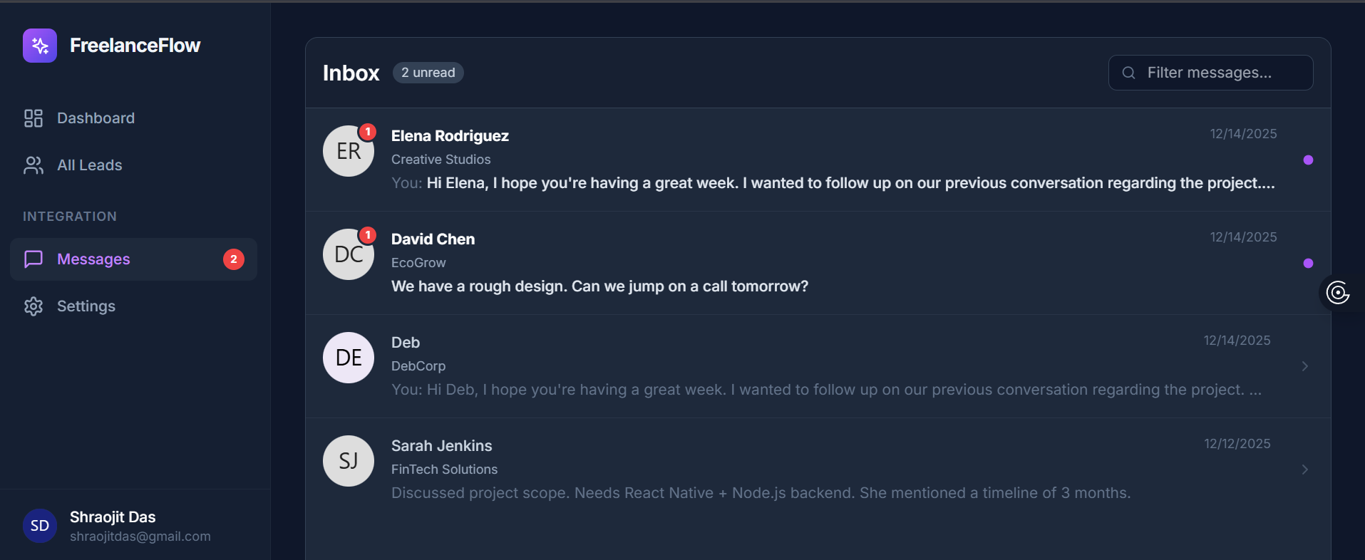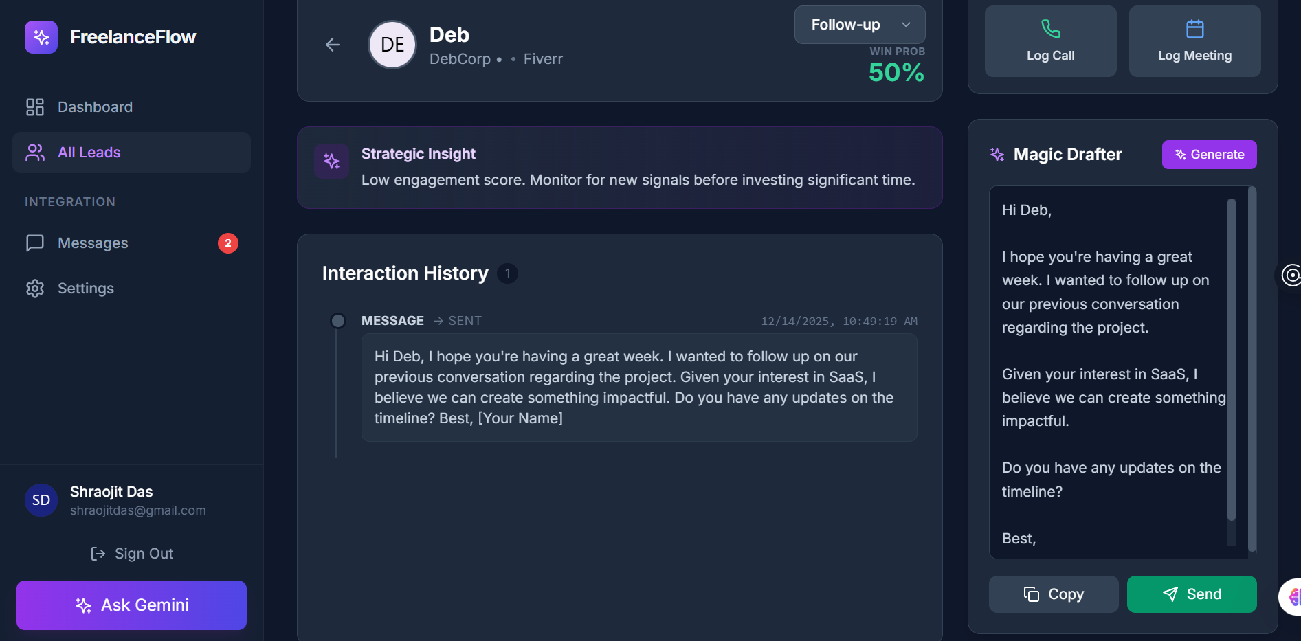 Problem Statement Freelancers struggle with: Leads scattered across multiple platforms No structured follow-up or prioritization system High cognitive load and emotional burnout Generic outreach messages with low conversion No learning loop from past wins and losses Existing tools are either too manual (CRMs) or too shallow (reminder apps). FreelanceFlow AI bridges this gap by combining deep data memory (MongoDB) with human-like reasoning and communication (Gemini AI).