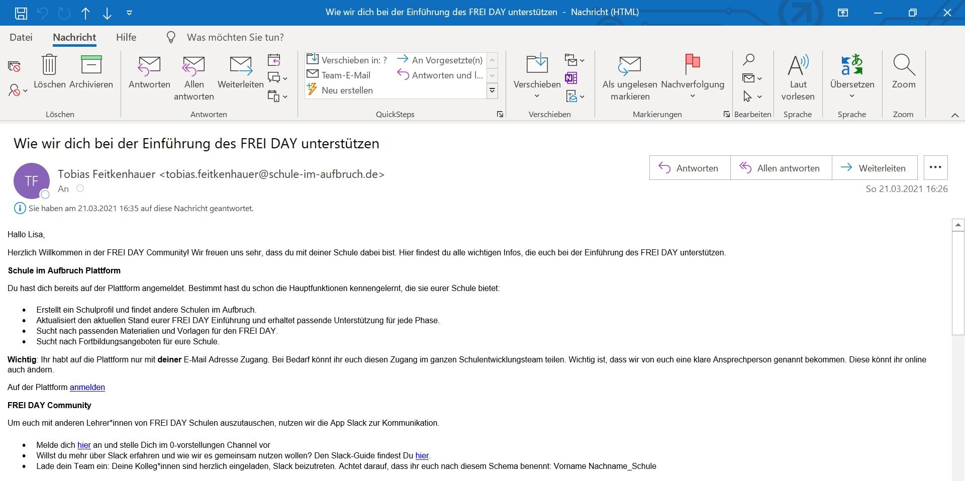 Außerdem wird unsere Lehrerin im Team, Lisa, den FREI DAY bei ihrer Schule vorstellen und mit ihrem Kollegium aufbrechen.