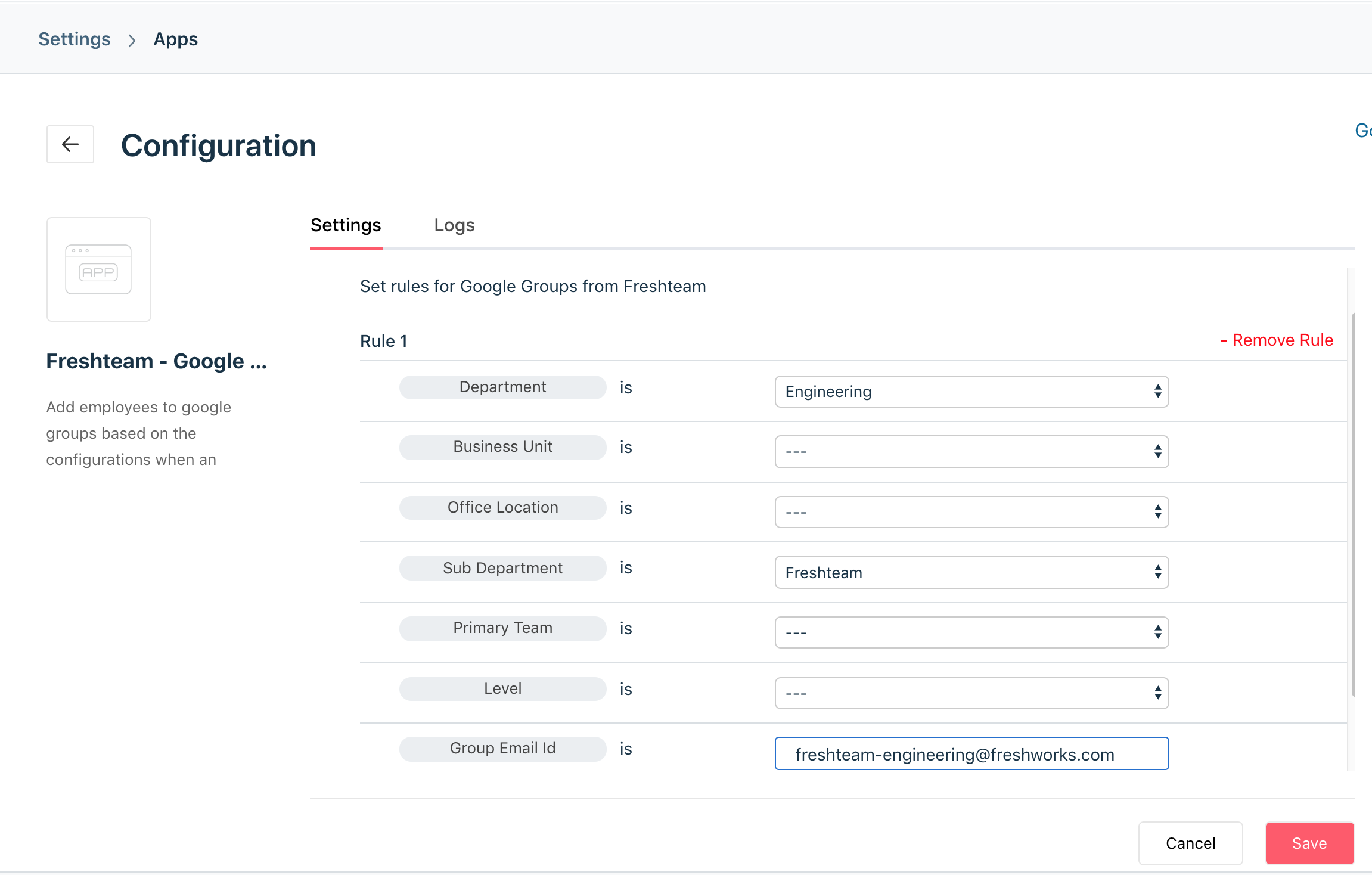We can configure a workflow which can assign google-groups to new joining employees automatically based on team, department or any other category. It also updates in google groups when an employee gets transferred internally, eg. When an employee gets transferred from Freshsales and Freshteam, they will be removed from Freshsales related groups and added to Freshteam related groups.