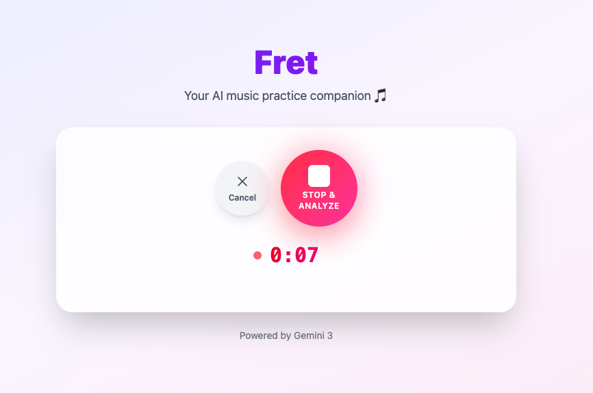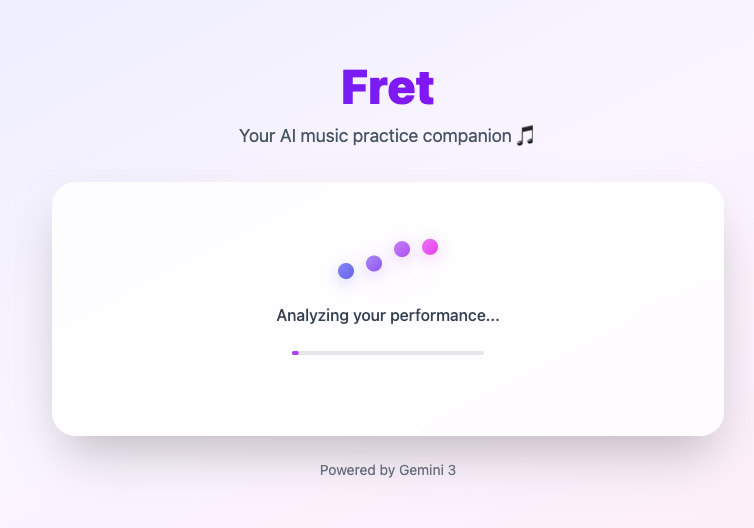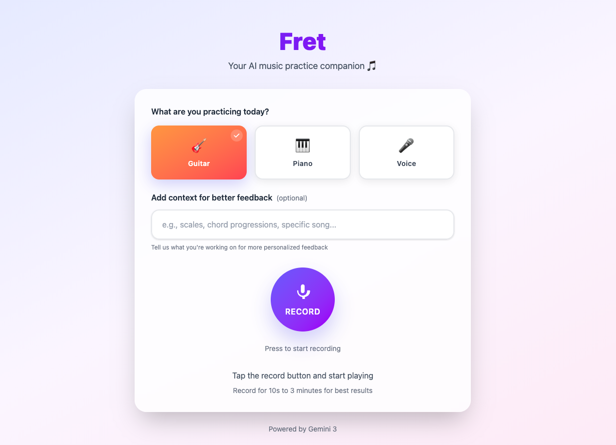 Fret is a mobile-first music practice assistant that uses Gemini 3's multimodal audio understanding to provide real-time feedback on your playing.