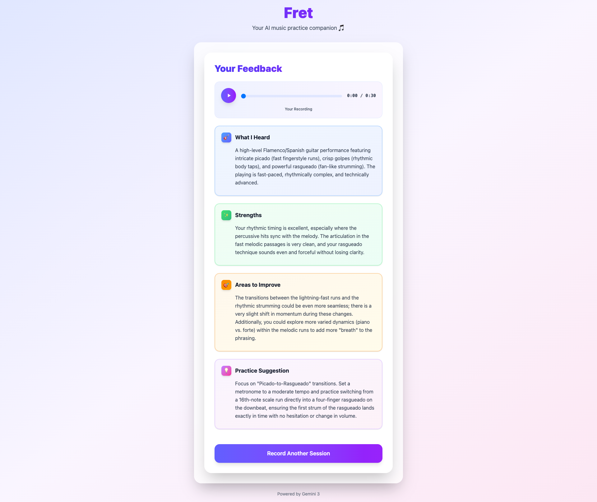 Fret sends raw audio recordings directly to Gemini 3 for analysis - no preprocessing, transcription, or MIDI conversion needed. The model listens to actual microphone input and identifies timing inconsistencies, technique issues, and musical patterns. It then generates structured feedback: what was played, specific strengths, concrete areas to improve, and targeted practice exercises.