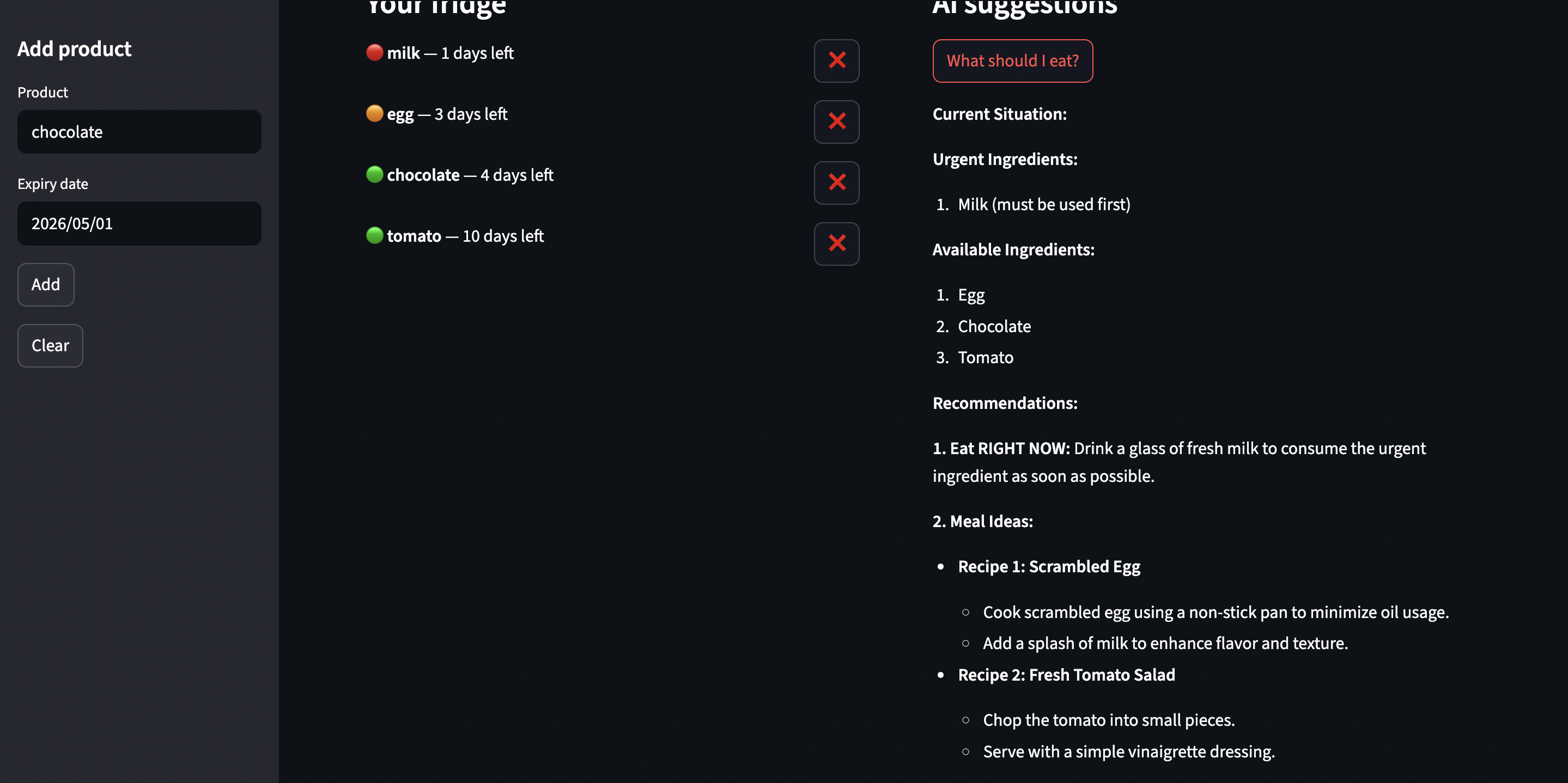I used Python and Streamlit for the interface and website hosting, the Groq API (LLM) to generate food decisions, and simple local storage (JSON file) to keep track of products in the fridge. The system sorts items by expiration and sends that data to the AI, which generates suggestions and recipes.