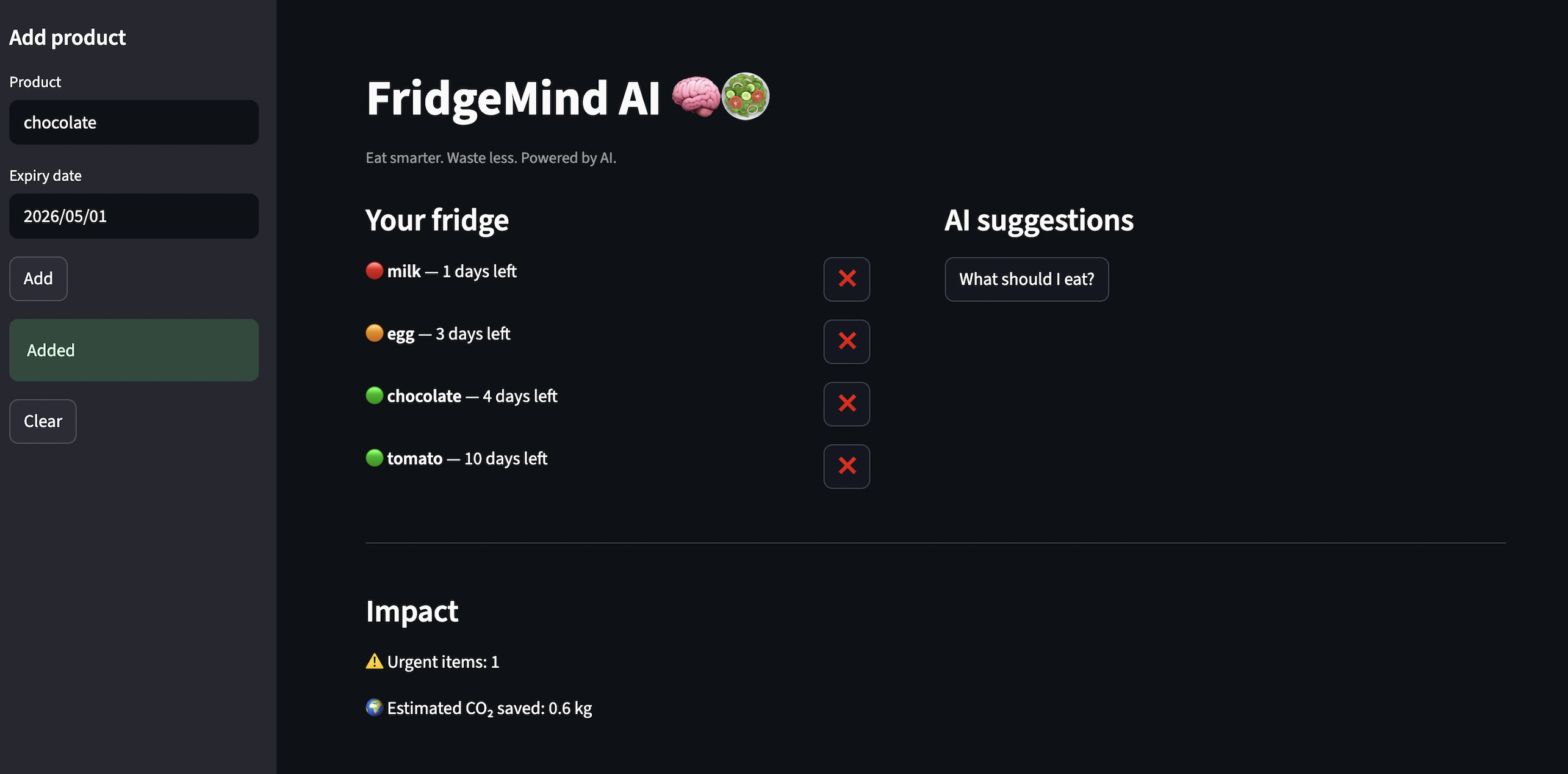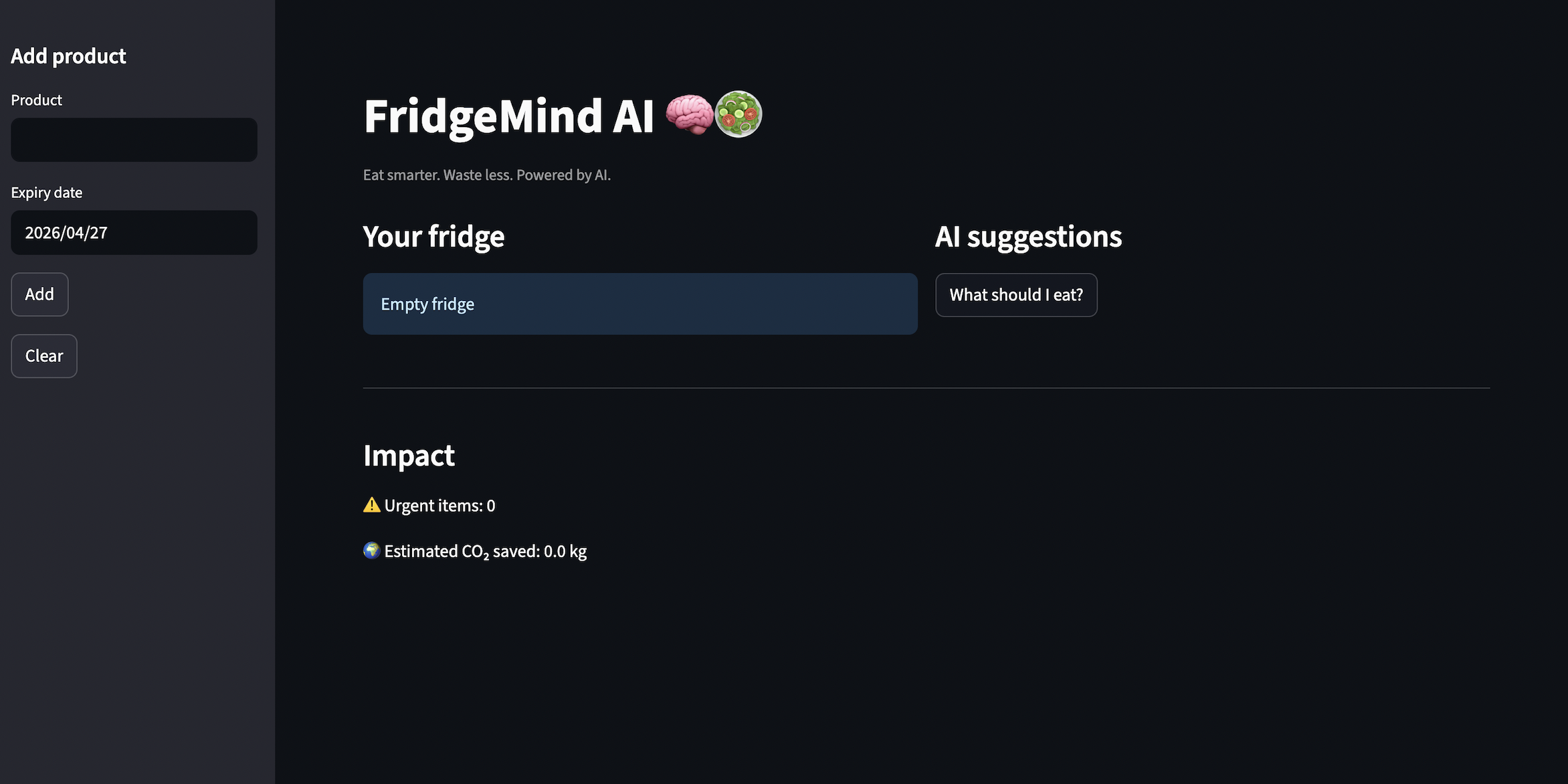 FridgeMind AI helps users decide what to eat based on what’s in their fridge and when it expires. Users can: -add products with expiration dates -see which items are urgent -get instant AI-powered suggestions on what to eat -see approximately how much CO₂ they can save The focus is not on recipes, but on making the right decision at the right time.