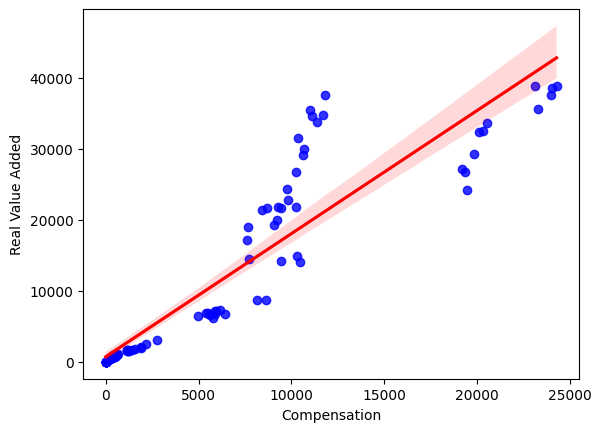 Real Value Added (in millions of dollars) vs Compensation (in thousands) to Determine Linear Relationship for Machine Learning Predictions