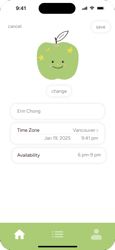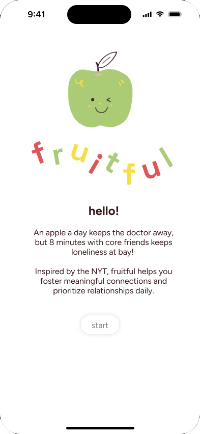 By combining these insights with the adage "an apple a day keeps the doctor away," fruitful reframes it for mental wellness and happiness. As a team of soon-to-be graduates, we set out to inspire users to schedule and maintain 8-minute check-ins, helping them nurture meaningful relationships while navigating the transition into busy post-graduate life. Since technology often fosters surface-level social interactions, we hoped for fruitful to provide a way to leverage technology for deeper, more rewarding connections.