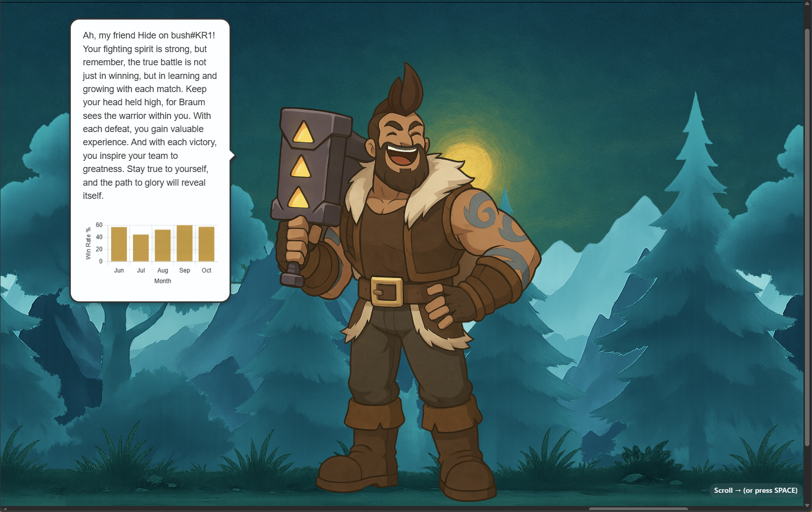 The project processes year-long match data from the Riot Games API and generates intelligent summaries using AWS Bedrock, all wrapped in an interactive parallax web interface featuring League champions (!).