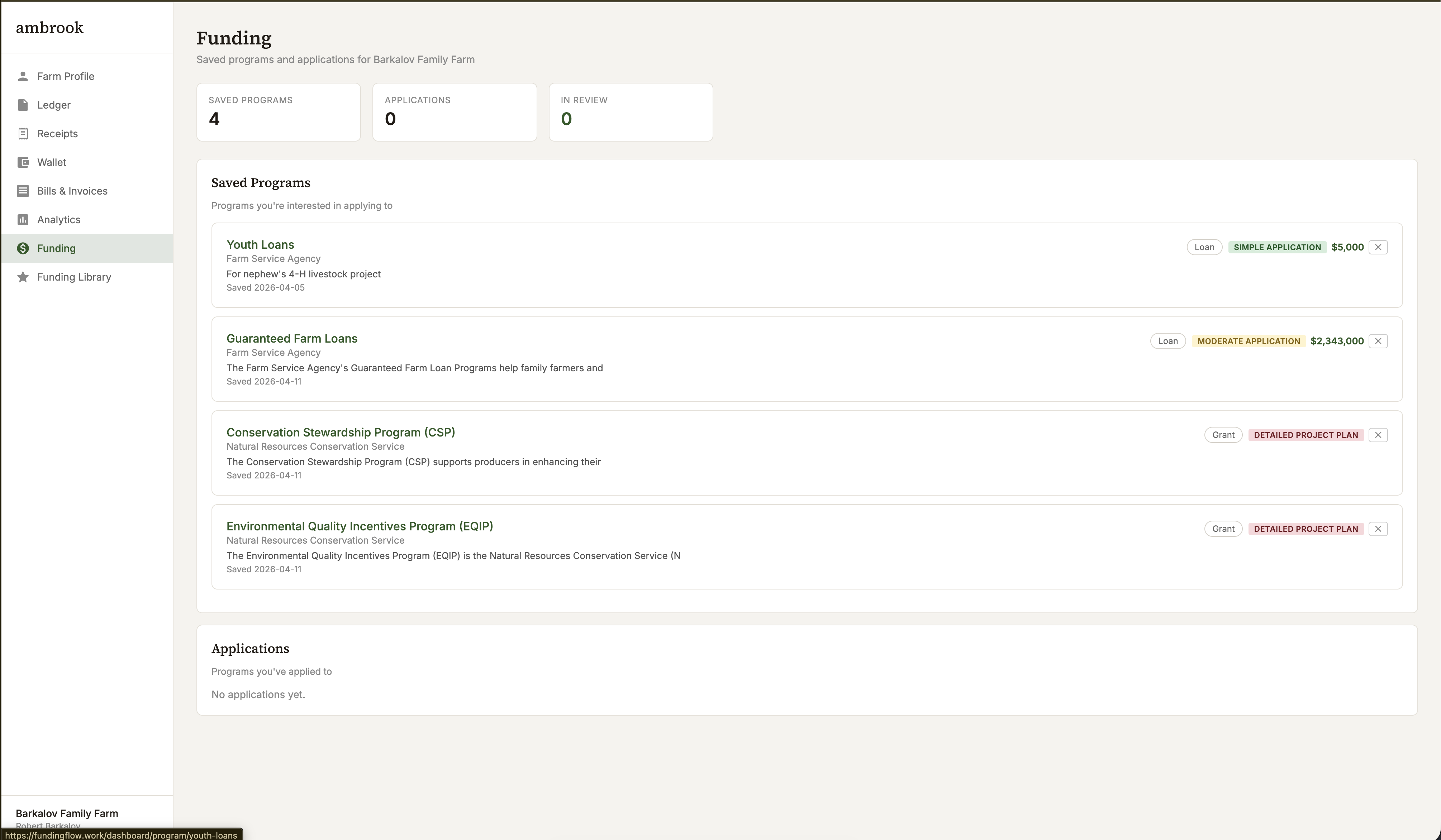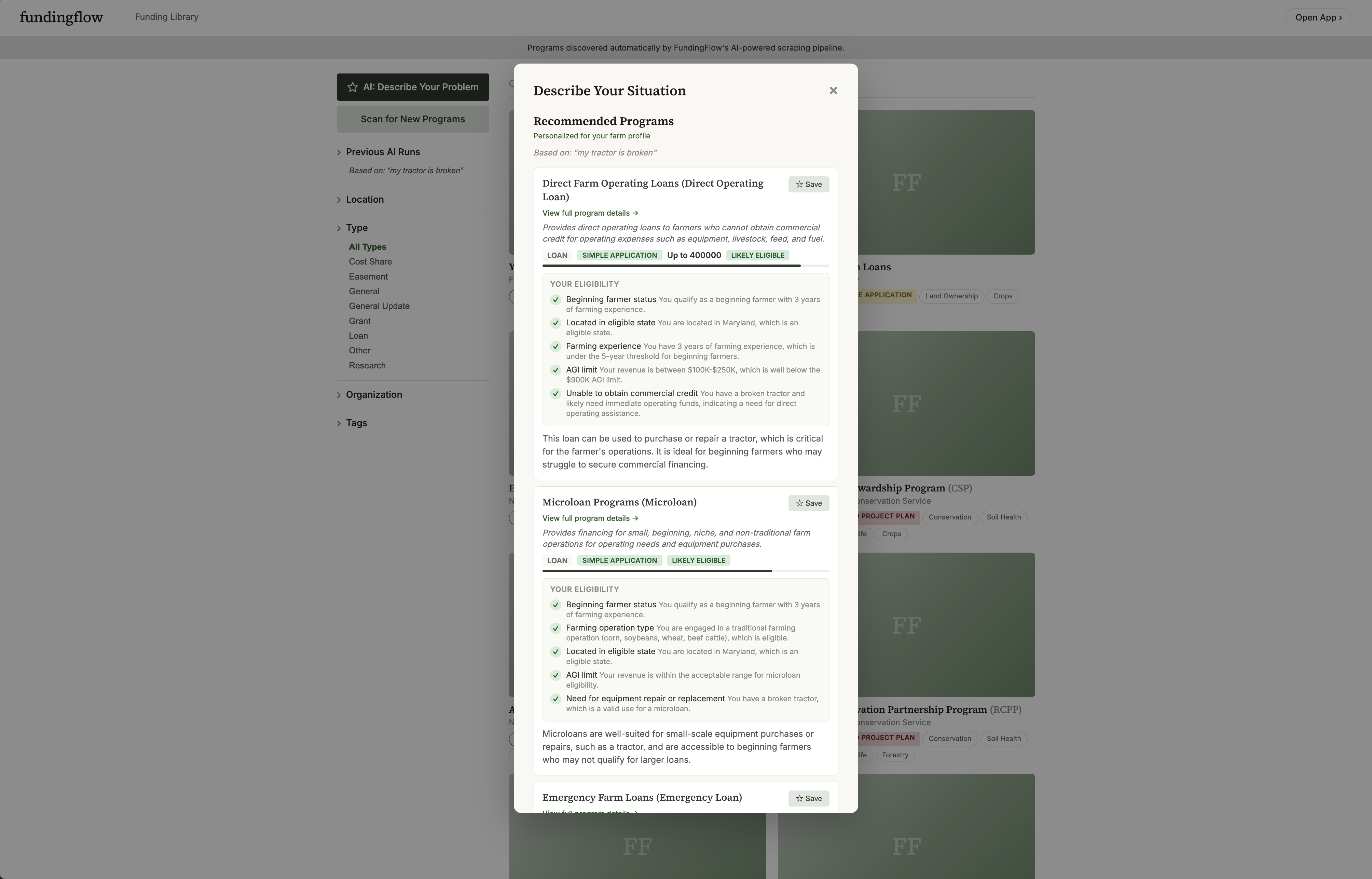 Farmers struggle to find government funding they qualify for, and existing tools have stale data with no application guidance.