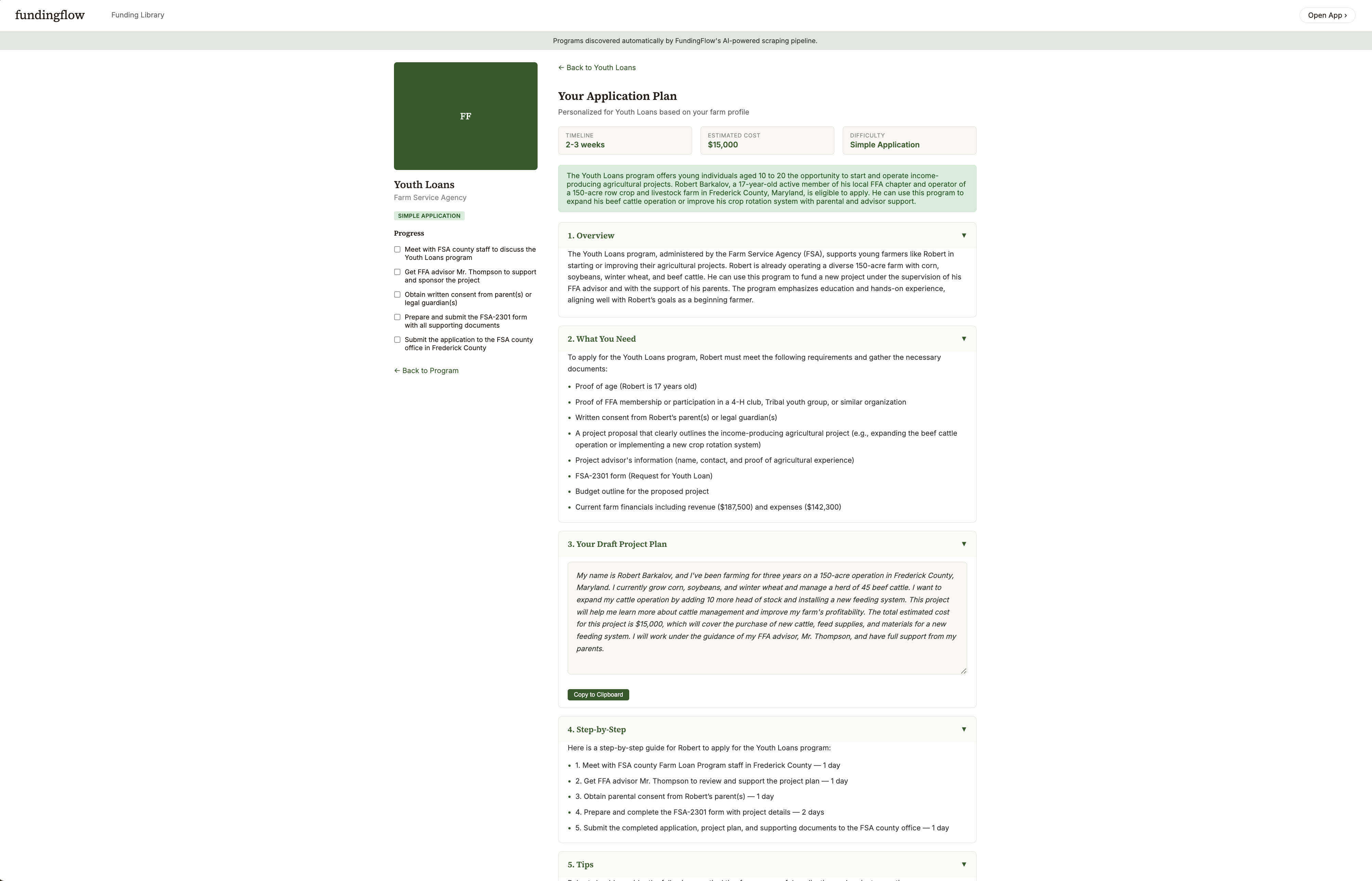 FundingFlow uses AI to automatically discover funding programs from government websites, match farmers to them via natural language, and generate personalized application plans with auto-filled PDF forms.