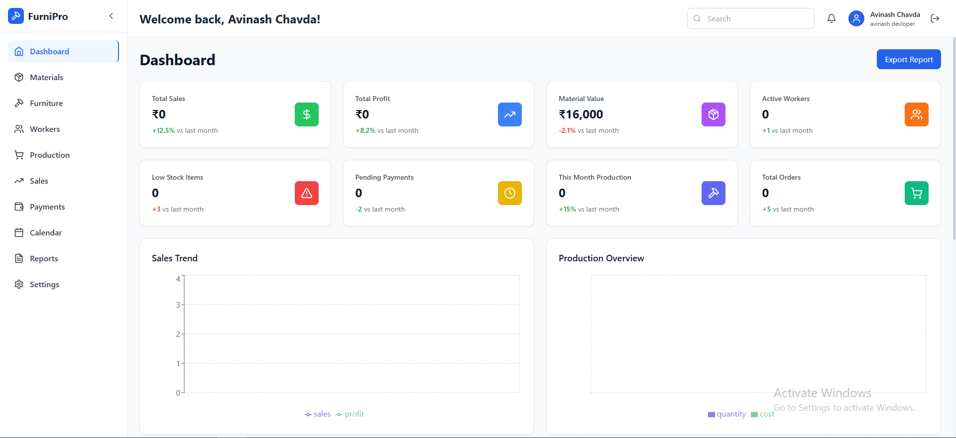 Inventory Management: Real-time monitoring of raw materials (wood, fabric, hardware) Production workflow tracking from workshop to delivery Low-stock alerts with supplier contact integration