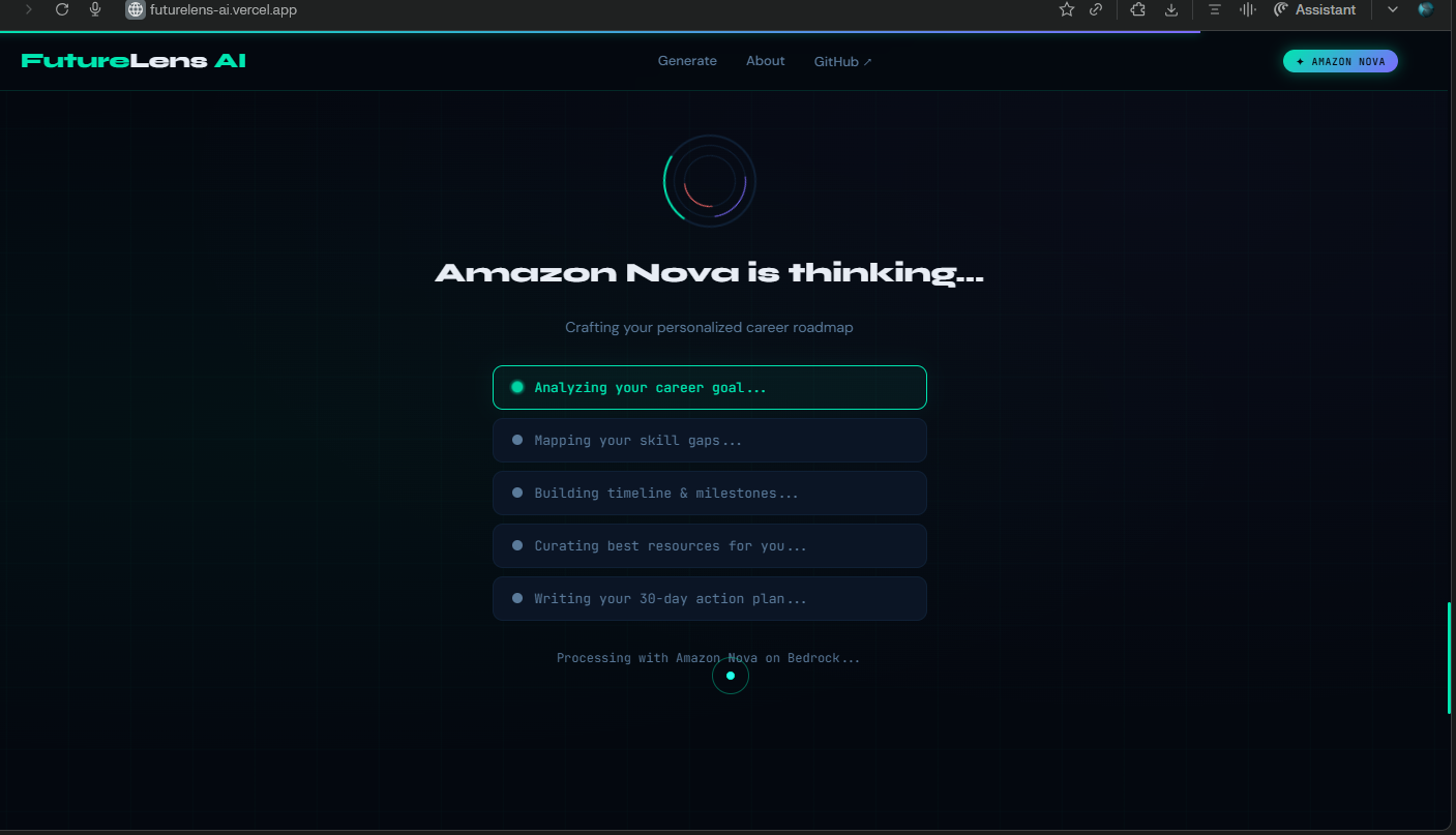 FutureLens AI is a career roadmap generator powered by Amazon Nova AI. You enter your name, dream career, education level, current skills, and interests. In seconds, Amazon Nova generates a fully personalized 5-tab roadmap including: