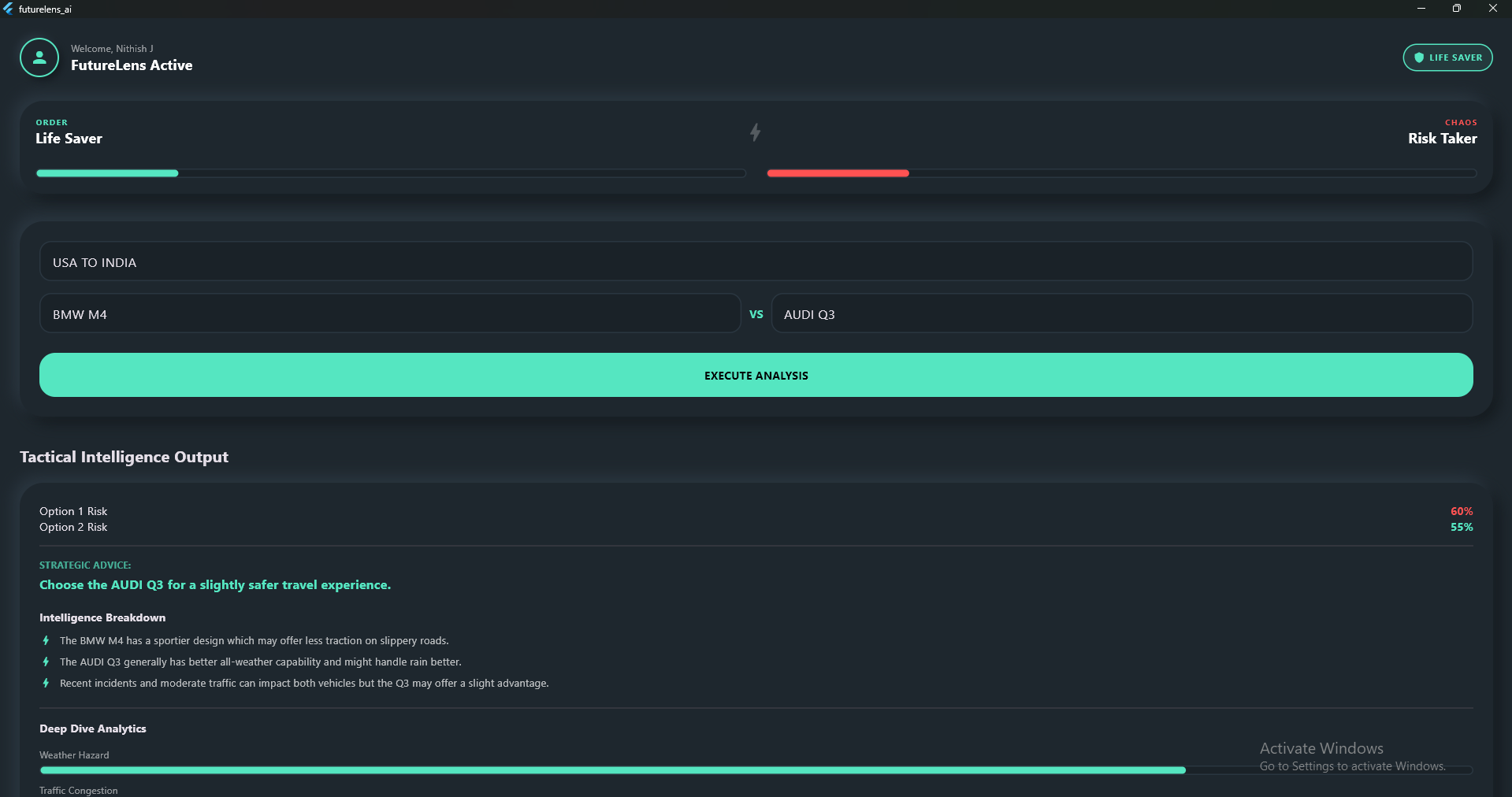 FutureLens AI is a context-aware decision intelligence platform. Instead of a standard chat interface, users input a core decision and pit two options against each other (e.g., Option 1: Bike via Mettupalayam VS Option 2: Bus via Kotagiri).