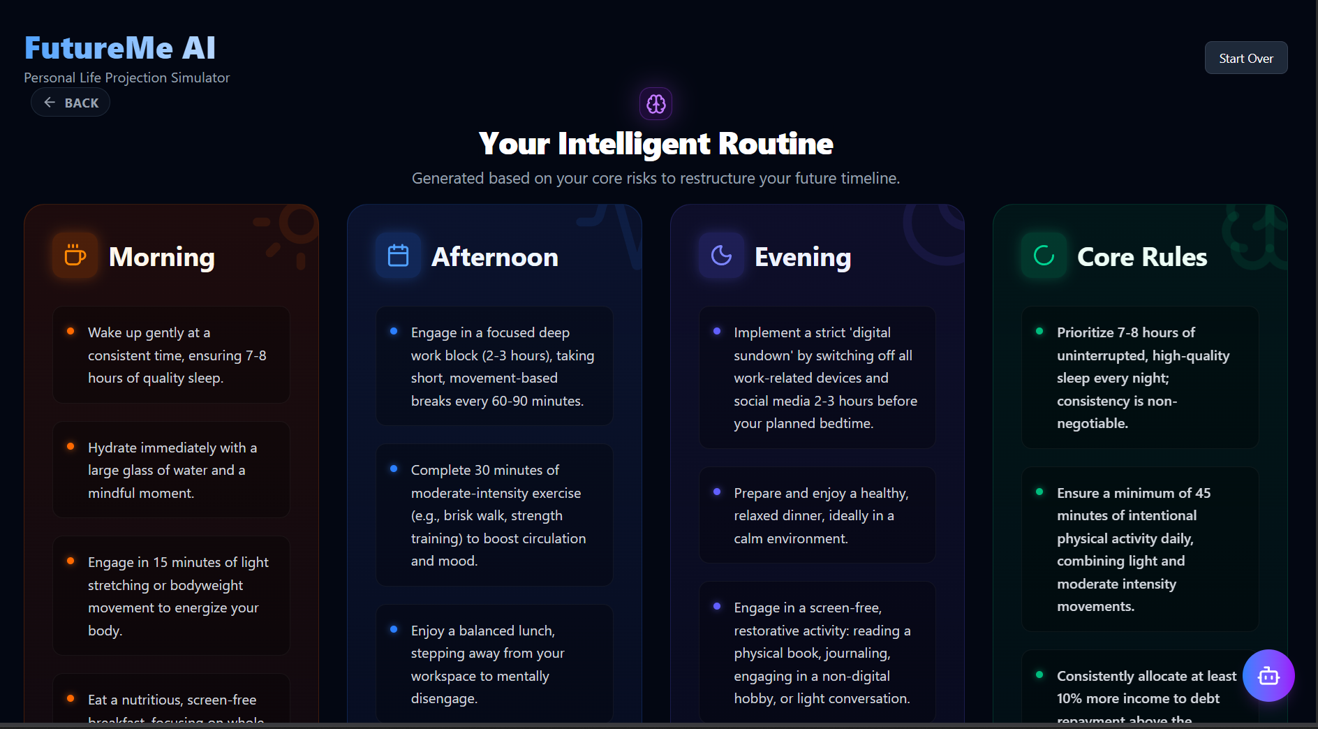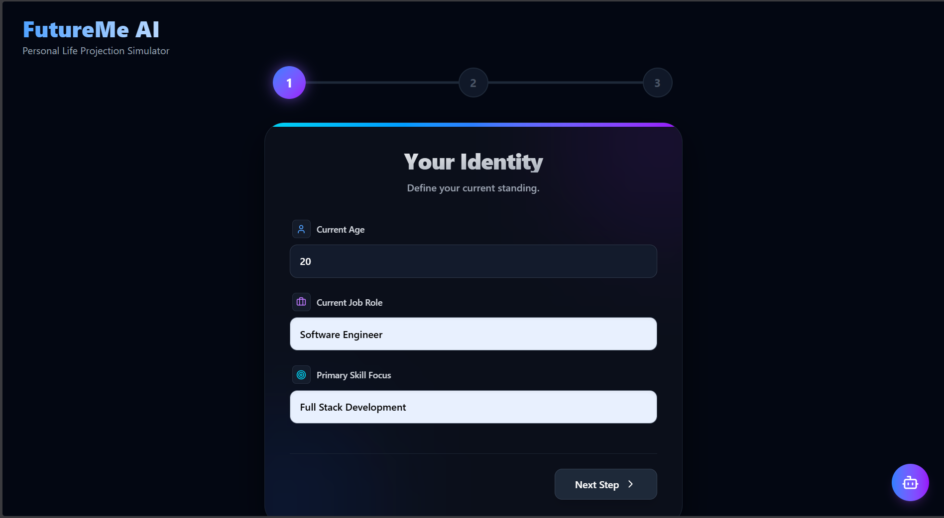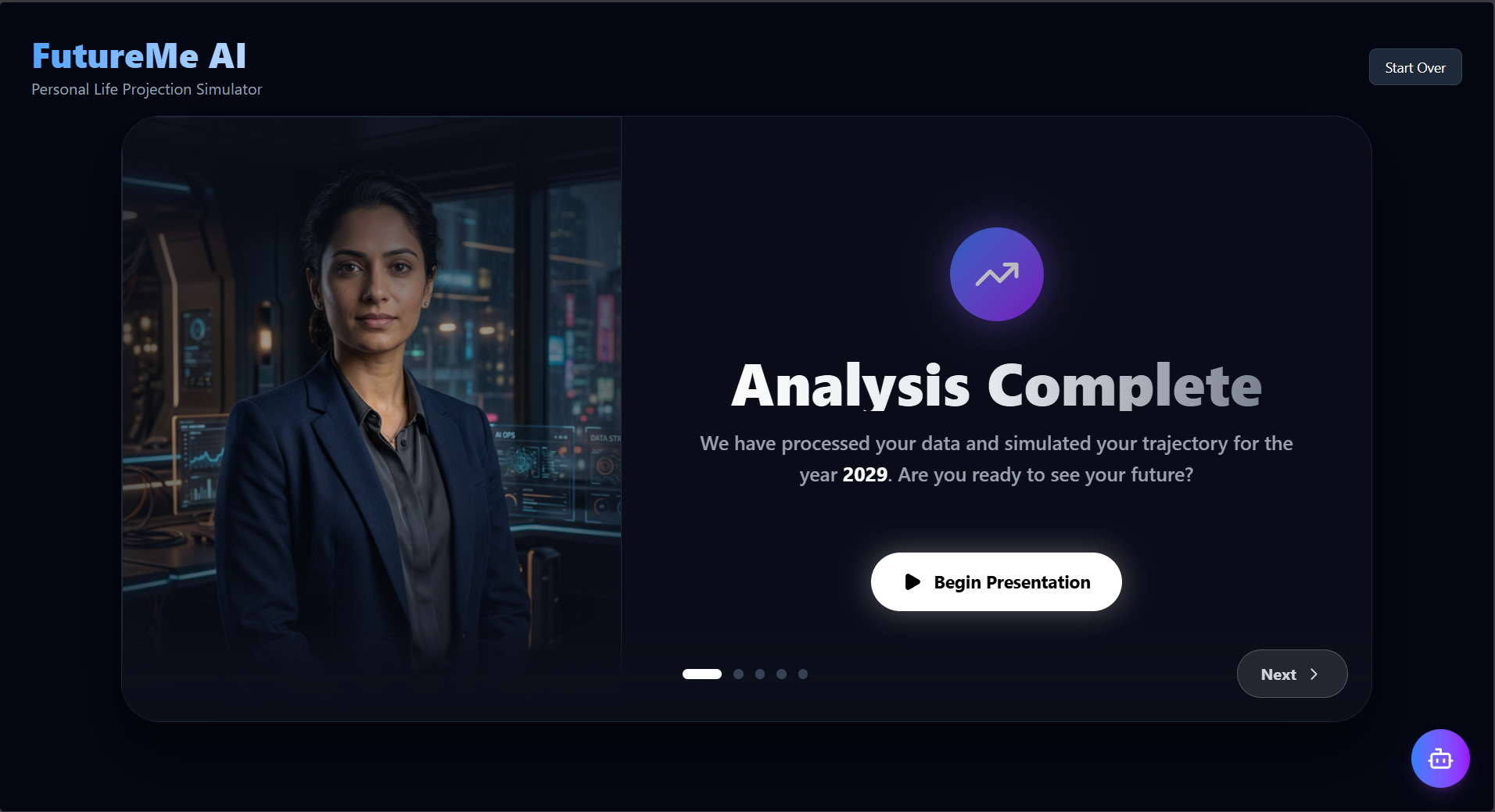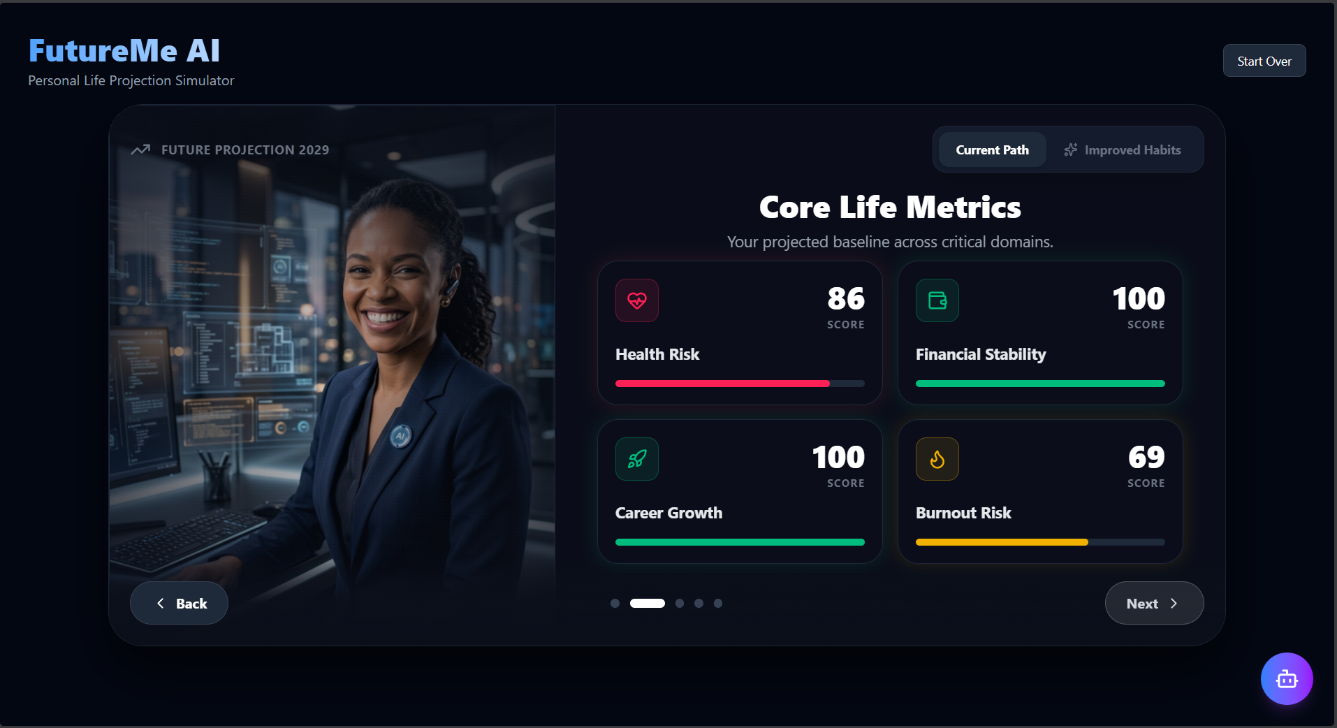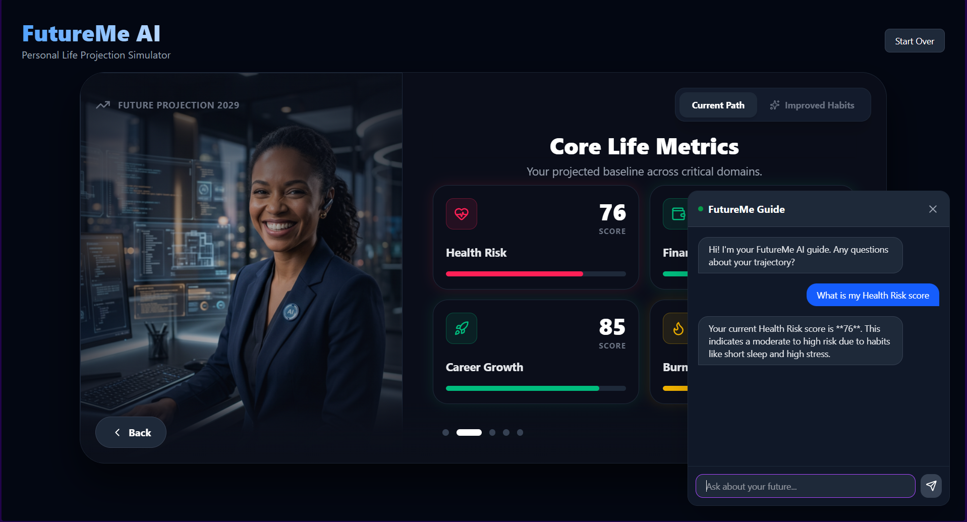 FutureMe AI is an interactive, 3-year life projection simulator that maps the cost of your current habits.